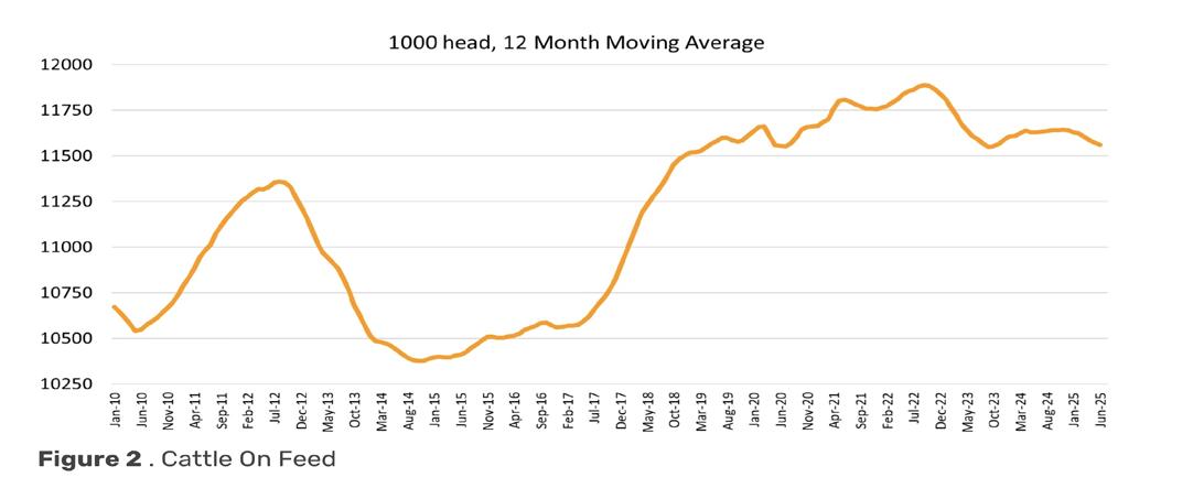 Despite lower placements, the July 1 feedlot inventory was 11.442 million head, down just 1.2 percent year over year. Feedlot inventories have been lower year over year for the past seven months but have averaged just a 1.2 percent decrease each of those months. Moreover, the June 12-month moving average of feedlot inventories is down just 2.8 percent from the cyclical peak in average feedlot inventories in September 2022 (Figure 2).