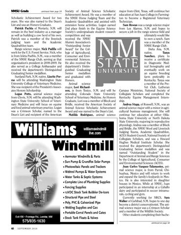 major from Clint, Texas, will continue her education at San Juan College in Farmington to become a Registered Veterinary Technician. Sam Rowan was a range science major from Los Alamos, N.M. and hopes to secure a job in the range science field and ultimately would like to own a ranch. Sam was a member of the NMSU Range Club. Doña Ana, N.M. native, Tanya Sanchez, plans to receive a certificate in Diagnostic Medical Sonography and eventually work on an equine breeding farm preferably in Kentucky. Tanya was a member of the PreVet Club, Lutheran Campus Ministries, National Society of Collegiate Scholars and completed the Kentucky Equine Management Internship. Andrea Stapp, of Roswell, N.M., was an animal science major with a minor in agricultural business management. She will continue her education at either Oklahoma State University or North Dakota State University, majoring in reproductive physiology. Andrea was a member of Block and Bridle, the NMSU Wool and Livestock Judging Teams, Academic Quadrathlon, ACES Student Council, National Society of Collegiate Scholars, and was a Howard Hughes Medical Institute Scholar. She received the department’s Distinguished Graduating Senior medallion and was named “Outstanding Student” in the Department of Animal and Range Sciences by the College of Agricultural, Consumer and Environmental Sciences (ACES). Juan Carlos Vazquez-Talamantes, animal science major, is from Parral, Chihuahua, Mexico and will return to work and expand the family’s feedyards in Mexico. He is also interested in slaughter houses in Mexico. While at NMSU, Juan participated in an internship at a Caballo dairy and participated in soccer intramurals, cycling and gym. Currently working for NRCS, Sara Walker of Carlsbad, N.M. hopes to one day become a district conservationist. The animal science major was a Crimson Scholar and a member of the Wildlife Society. Other students completing their bachecontinued on page 40