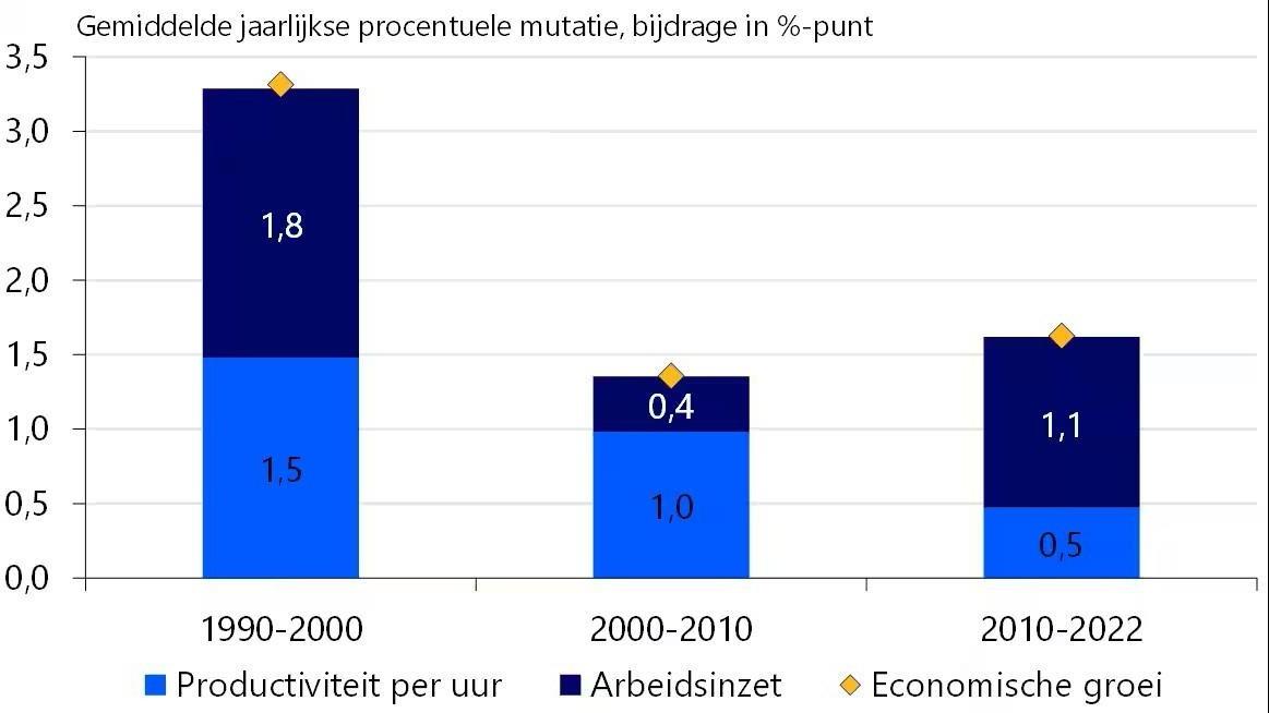 • Vooral toename productiviteit stagneert: we werken meer, niet slimmer. Vorig jaar zelfs afname arbeidsproductiviteit