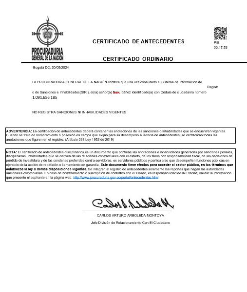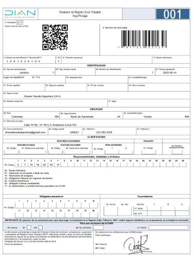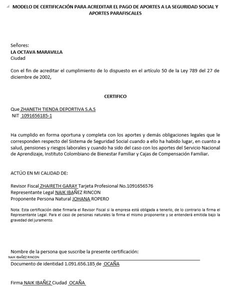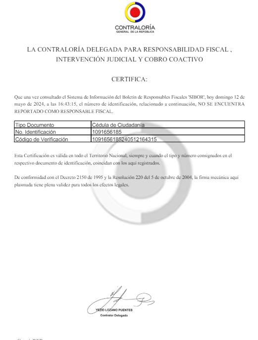 RINCÓN, con cédula de ciudadanía N° 1 091 656 185 representante de la empresa ZHANETH