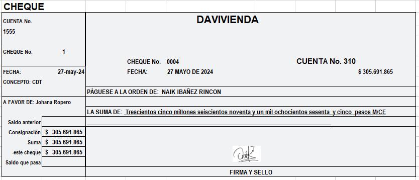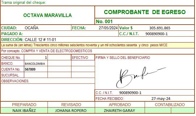 En el municipio "OCAÑA" a los 27 días del mes de mayo de 2024, se suscribe la presente acta de entrega de electrodomésticos, mercancía en óptima y perfectas condiciones. NAIK IBAÑEZ