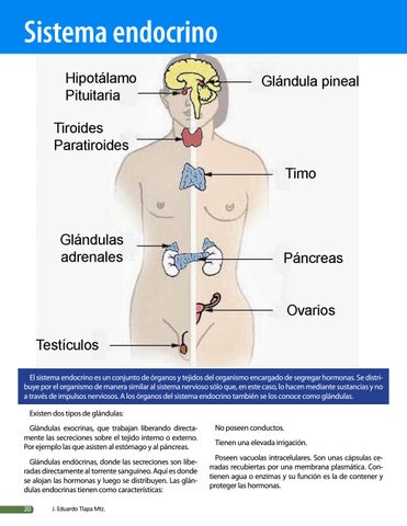 El sistema endocrino es un conjunto de órganos y tejidos del organismo encargado de segregar hormonas. Se distribuye por el organismo de manera similar al sistema nervioso sólo que, en este caso, lo hacen mediante sustancias y no a través de impulsos nerviosos. A los órganos del sistema endocrino también se los conoce como glándulas. Existen dos tipos de glándulas: Glándulas exocrinas, que trabajan liberando directamente las secreciones sobre el tejido interno o externo. Por ejemplo las que asisten al estómago y al páncreas. Glándulas endócrinas, donde las secreciones son liberadas directamente al torrente sanguíneo. Aquí es donde se alojan las hormonas y luego se distribuyen. Las glándulas endocrinas tienen como características: 20
