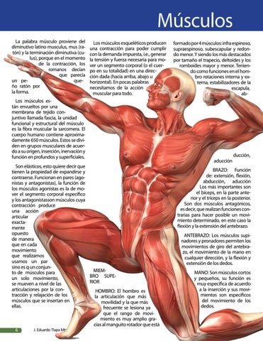 Los músculos están envueltos por una membrana de tejido conjuntivo llamada fascia, la unidad funcional y estructural del músculo es la fibra muscular la sarcomera. El cuerpo humano contiene aproximadamente 650 músculos. Estos se dividen en grupos musculares de acuerdo a su origen, inserción, inervación y función en profundos y superficiales. Son elásticos, esto quiere decir que tienen la propiedad de expandirse y contraerse. Funcionan en pares (agonistas y antagonistas), la función de los músculos agonistas es la de mover el segmento corporal específico y los antagonistasson músculos cuya contracción produce una acción articular exactamente opuesto de manera que en cada movimiento que realizamos usamos un par sino es q un conjunMIEMto de músculos para BRO SUPEun solo movimiento, RIOR se mueven a nivel de las articulaciones por la conHOMBRO: El hombro es tracción y relajación de los la articulación que más músculos que se insertan en movilidad y la que más ellas. frecuente se lesiona ya que el rango de movimiento es muy amplio gracias al manguito rotador que está