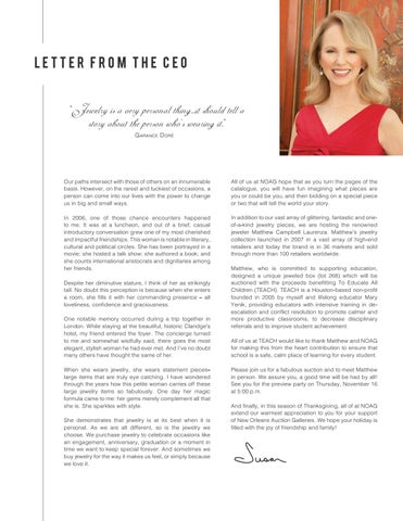 All of us at NOAG hope that as you turn the pages of the catalogue, you will have fun imagining what pieces are you or could be you, and then bidding on a special piece or two that will tell the world your story.
