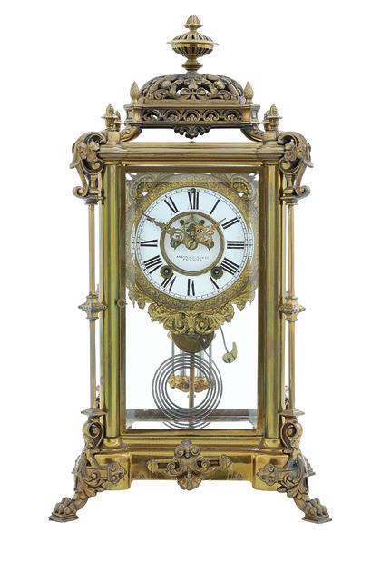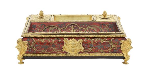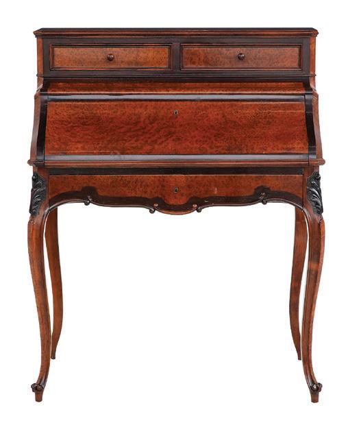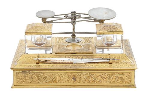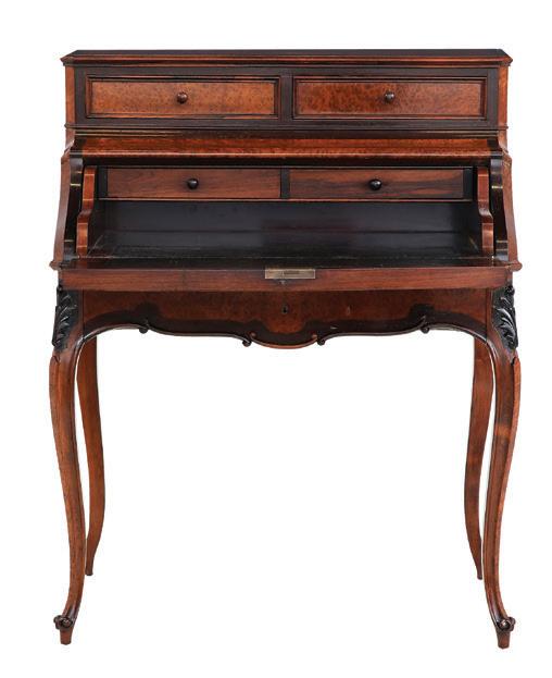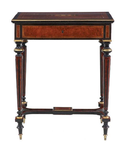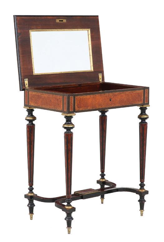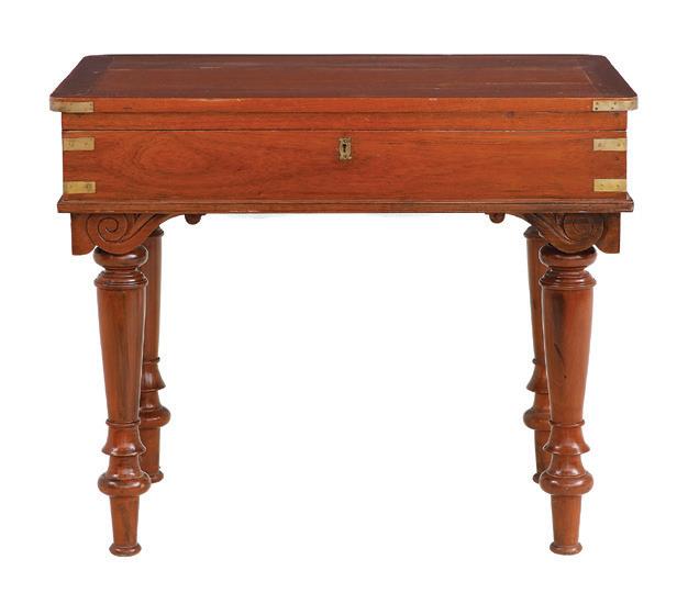 19th century, the brass-bound rectangular top opening to letter holders in the inside top and a variety of lidded compartments and lift-out trays, the central one lifting to an easeled back, the whole raised on turned, tapering circular legs ending in toupie feet.