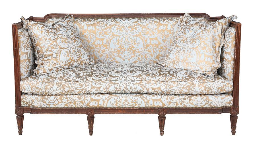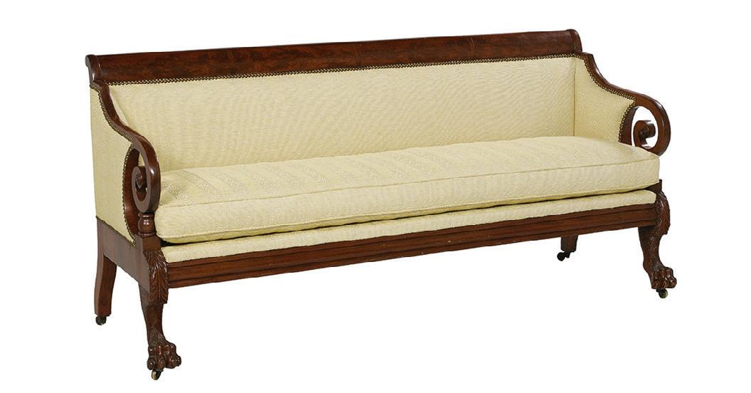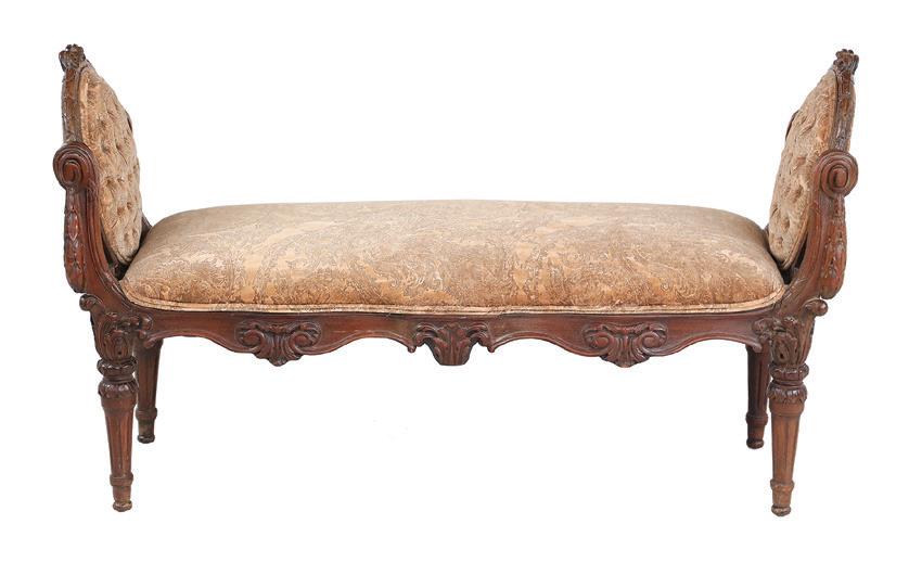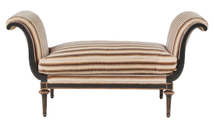 of neoclassical form with tall, fluted scroll ends, raised on lobed and fluted trumpet legs, the seat with a loose cushion, upholstered in striped cut velvet, labeled, “Nancy Corzine Furniture”.