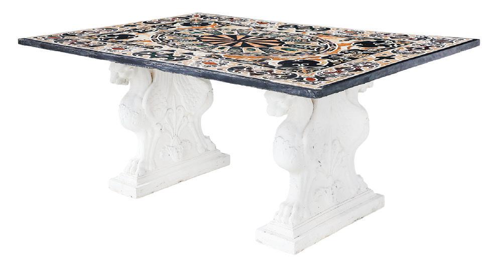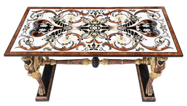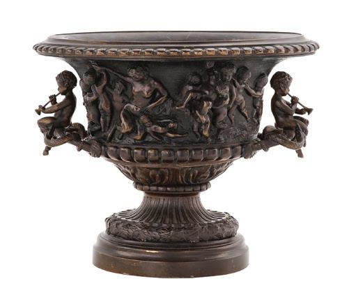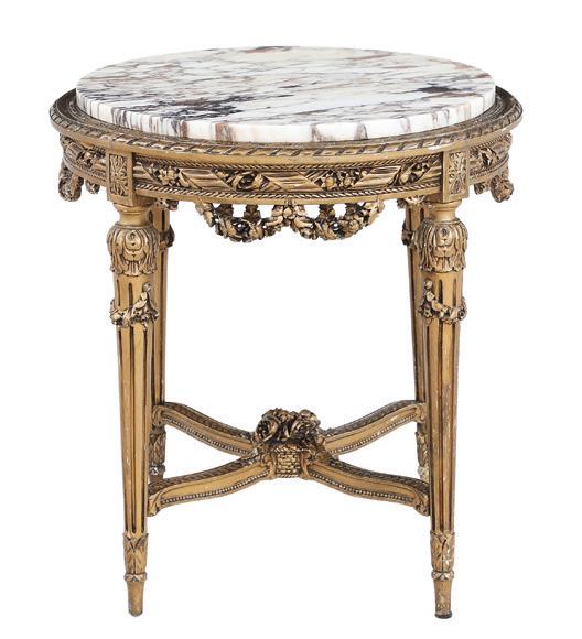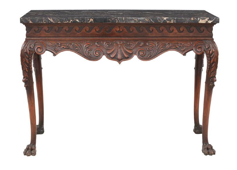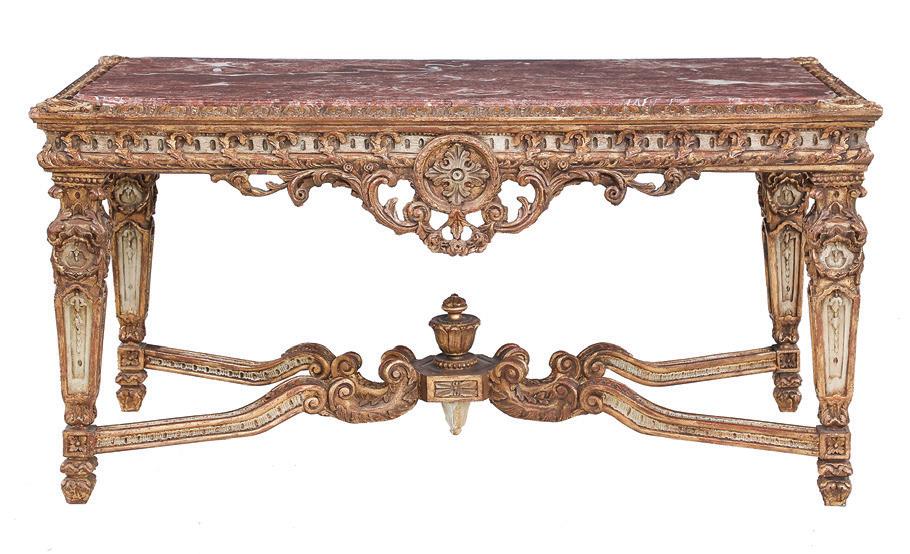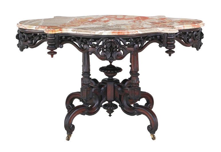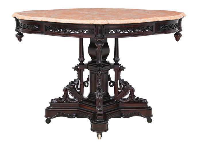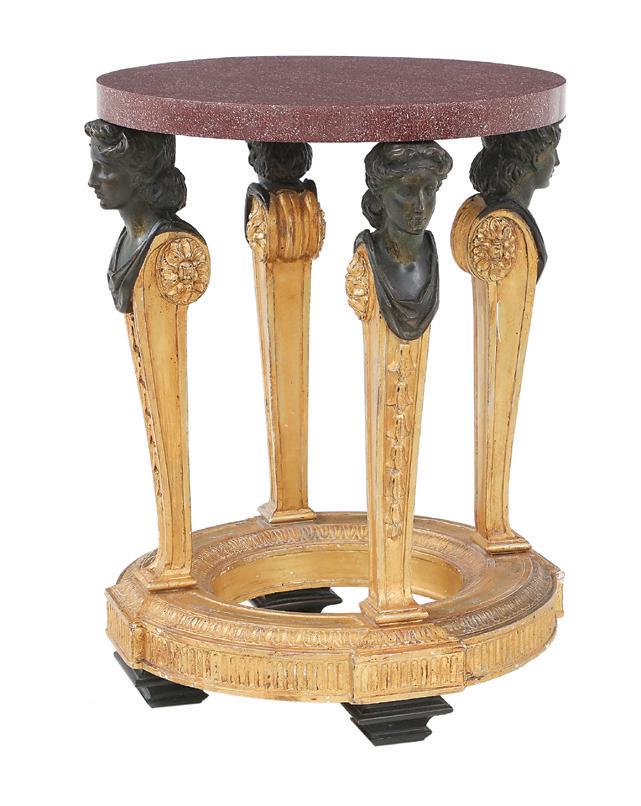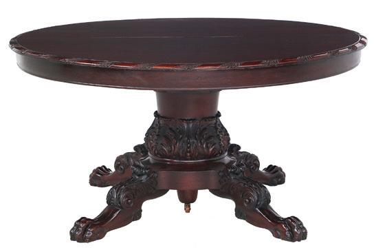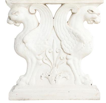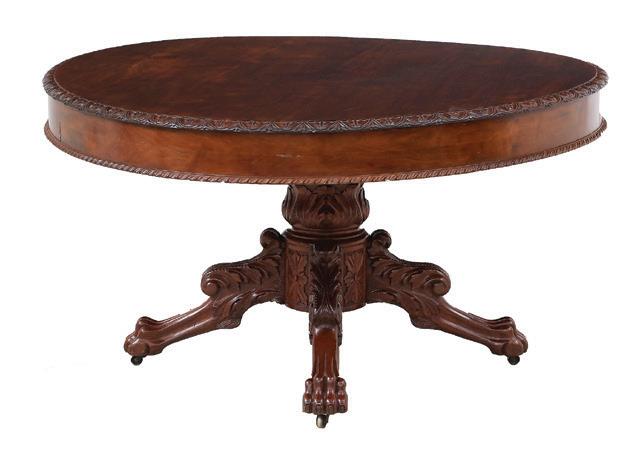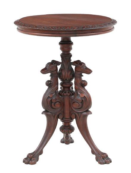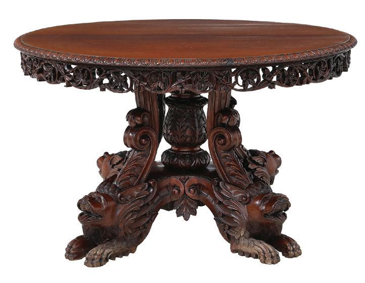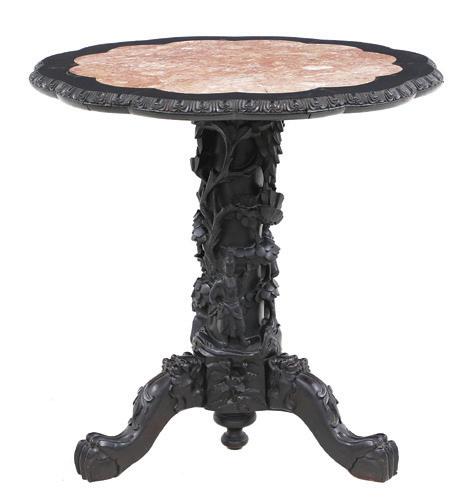 late 19th/early 20th century, in the rococo taste, the circular top with an open-carved apron, raised on a base with a leaf-carved central vasiform pedestal flanked by four legs with like carving and terminating in a carved mythological figure’s winged heads with paw feet.