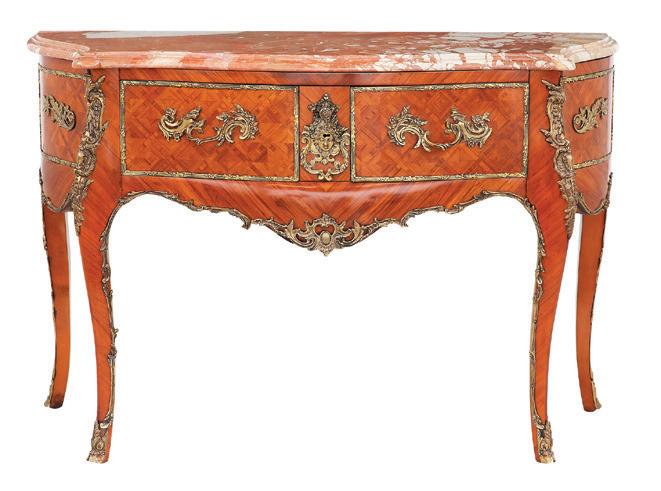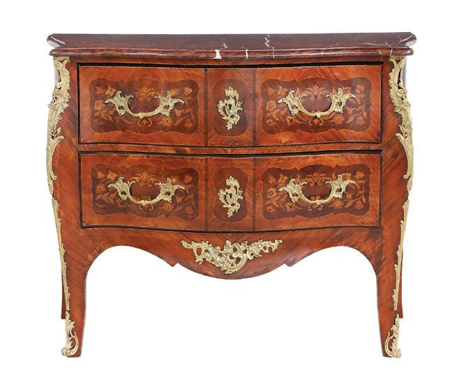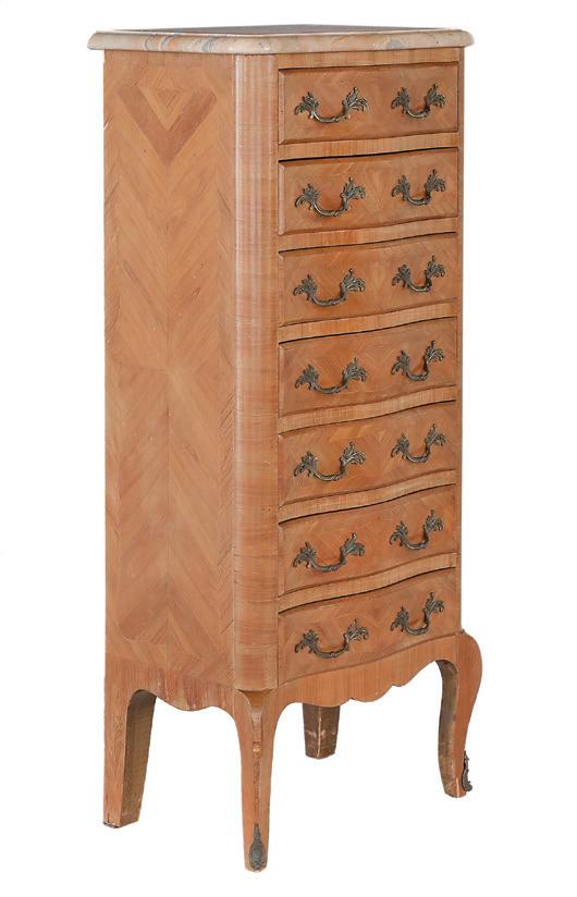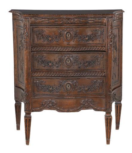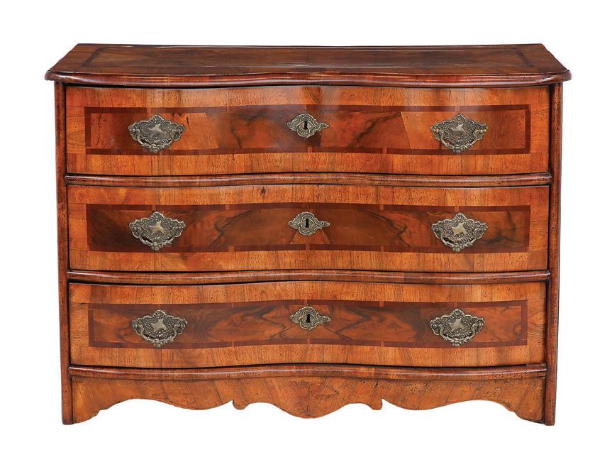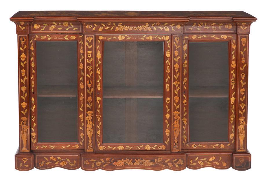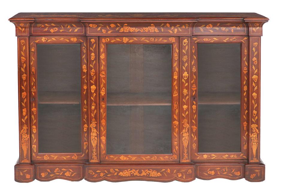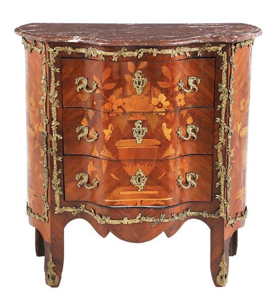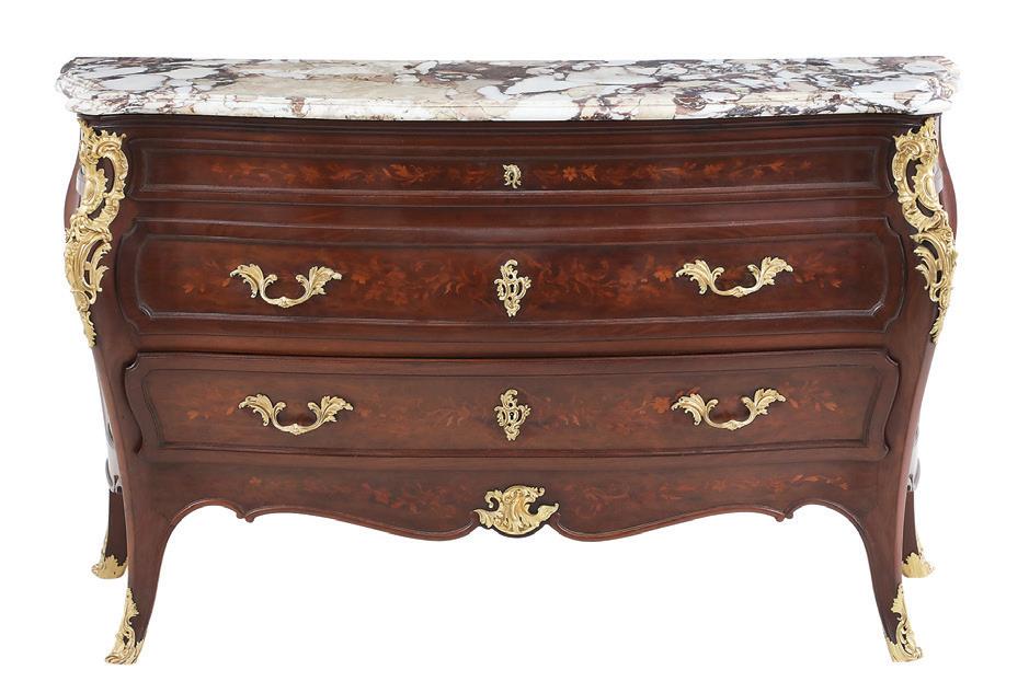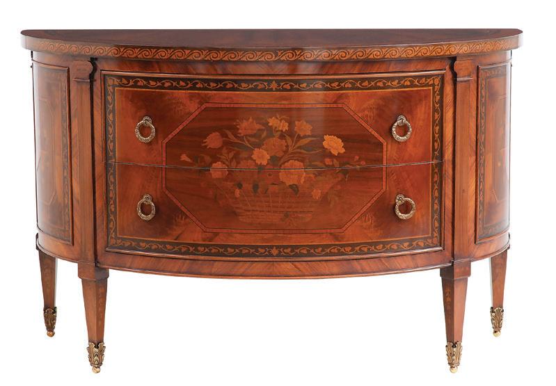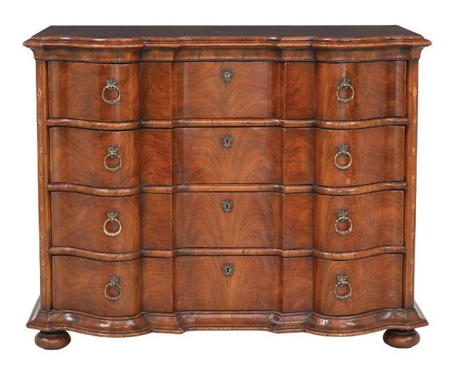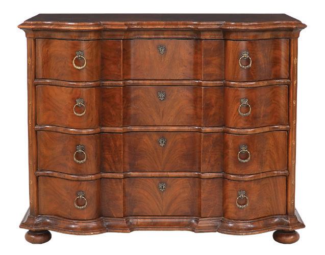 early 20th century, attributed to W. & J. Sloane, New York, the rectangular breakfront top with projecting canted corners, above a conforming case fitted with a central drawer over an acanthine-carved cupboard, flanked to both sides by three short concave drawers, raised on block feet fronted by acanthine scrolls, the drawer locks engraved “Secure 2 Lever, W. & J. Sloane”. h. 37”, w. 55-1/2”, d. 23-1/2”
