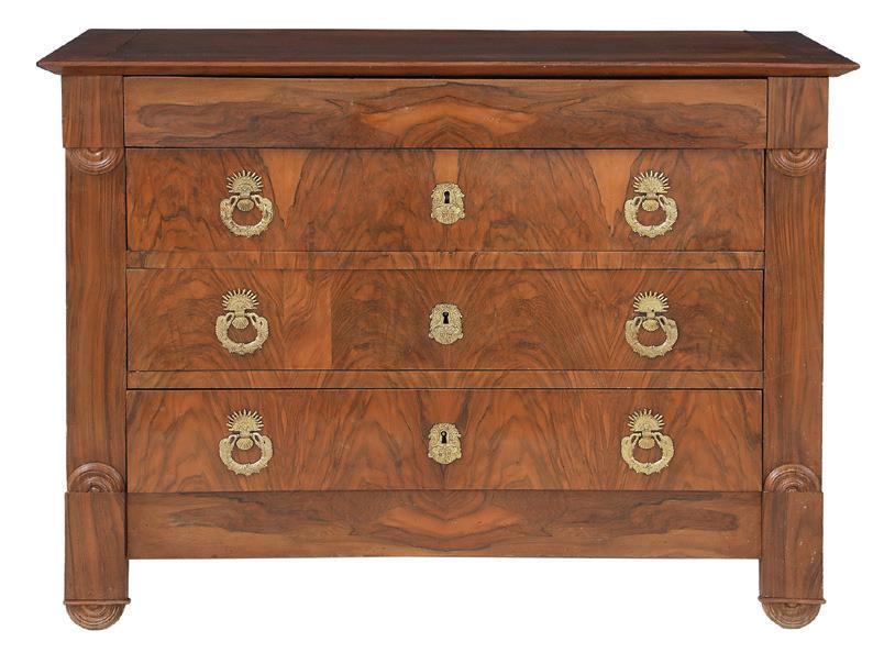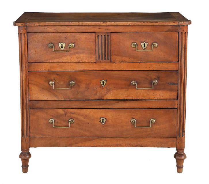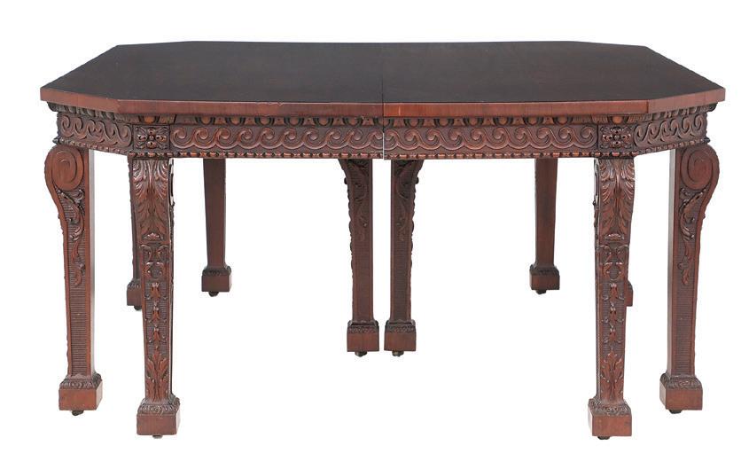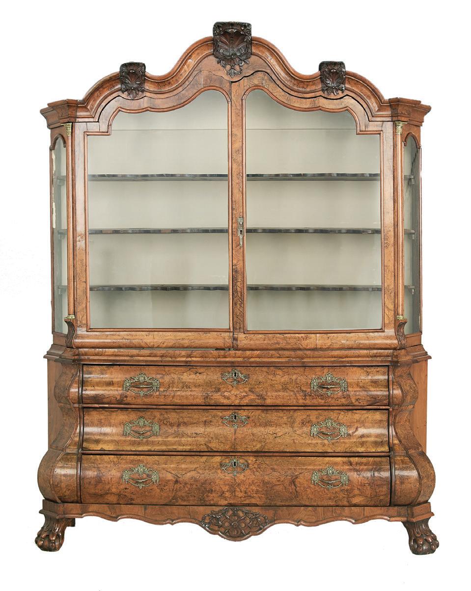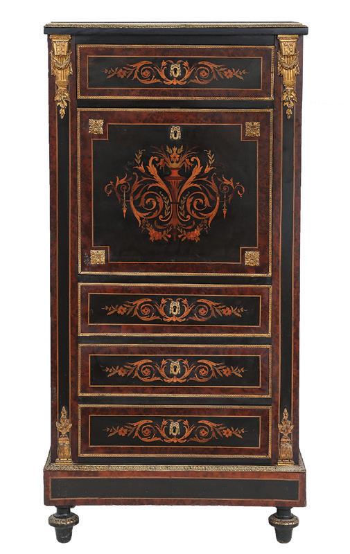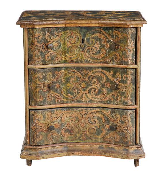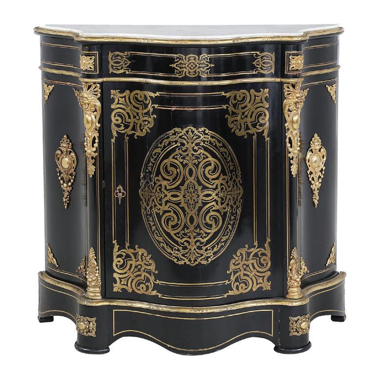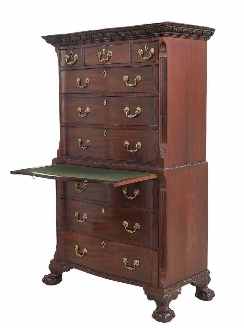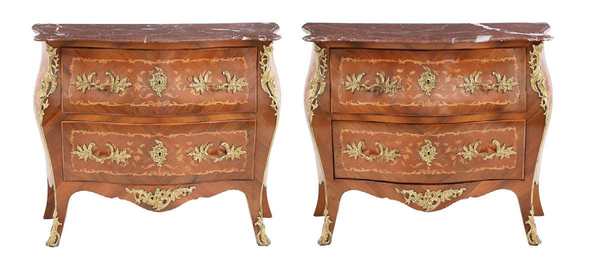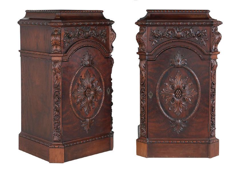 early 20th century, attributed to W. & J. Sloane, New York, the rectangular breakfront top with projecting canted corners, above a conforming case fitted with a central drawer over an acanthine-carved cupboard, flanked to both sides by three short concave drawers, raised on block feet fronted by acanthine scrolls, the drawer locks engraved “Secure 2 Lever, W. & J. Sloane”. h. 37”, w. 55-1/2”, d. 23-1/2”