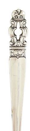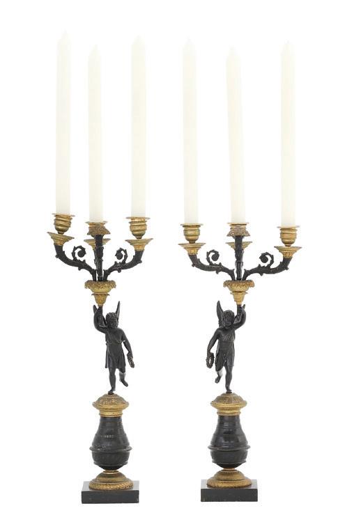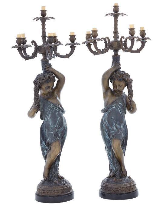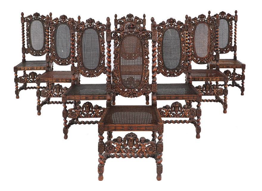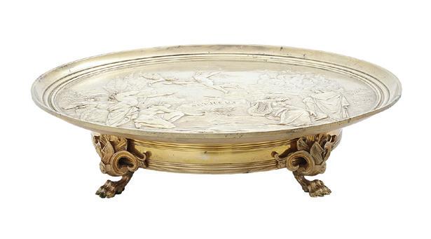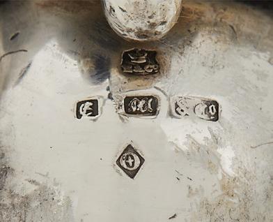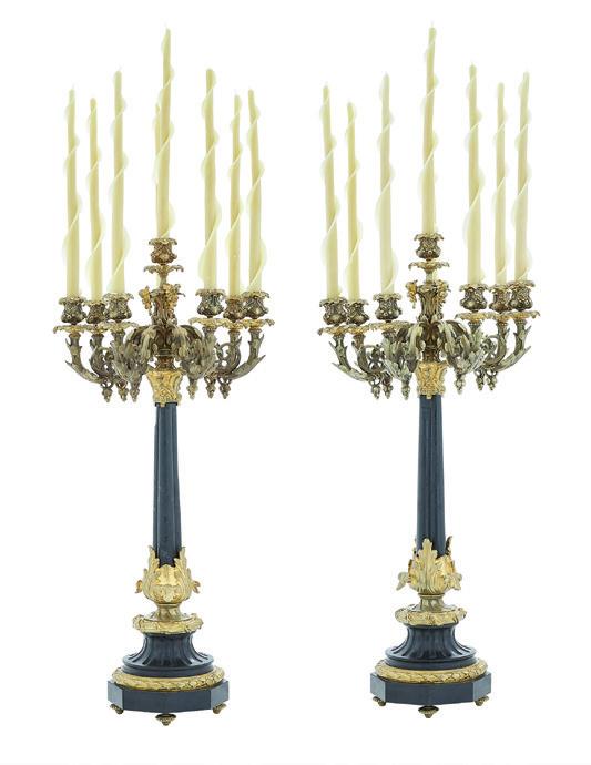 1853, Birmingham, with a twining grapevine standard above a waisted cylindrical base raised on three robust acanthus scroll feet with apron en suite, surmounted by a smaller twining grapevine base surrounded by five scrolling arms, the arms ending in candle nozzles with drip-pan and detachable bobeche, the central standard surmounted by a fruit basket, the whole decorated with realistic grape clusters and leaves.