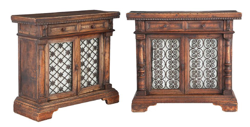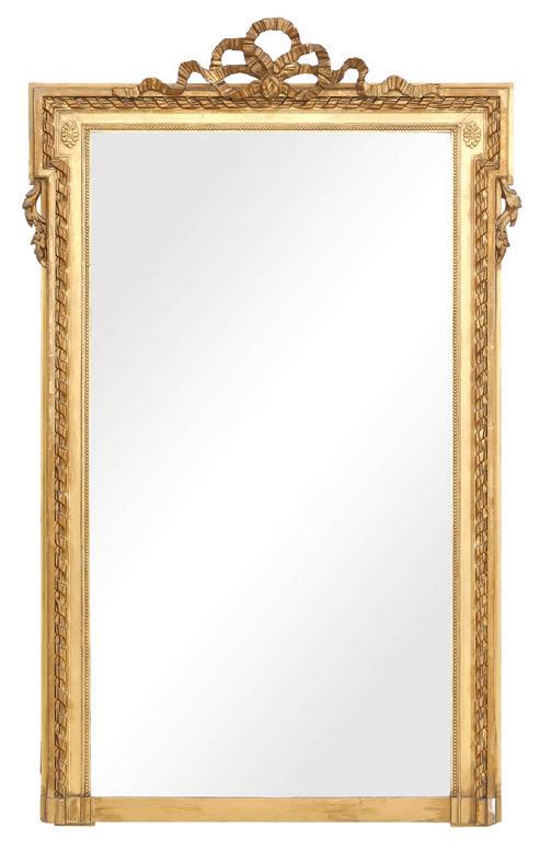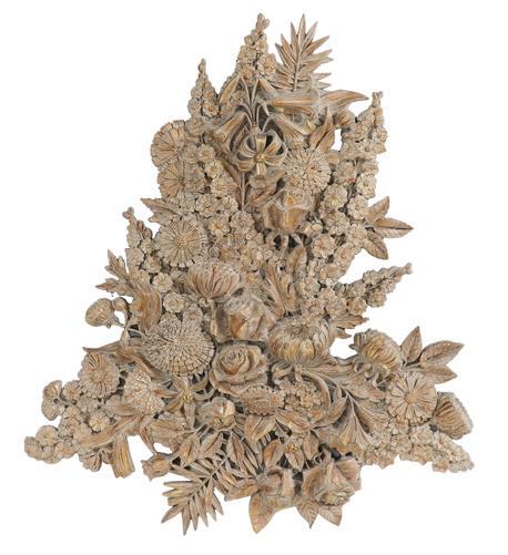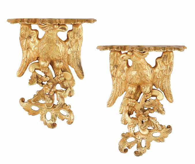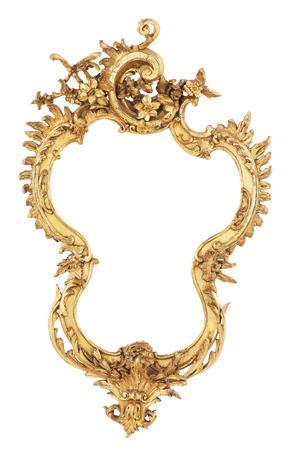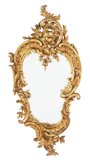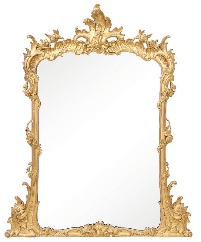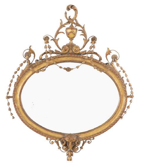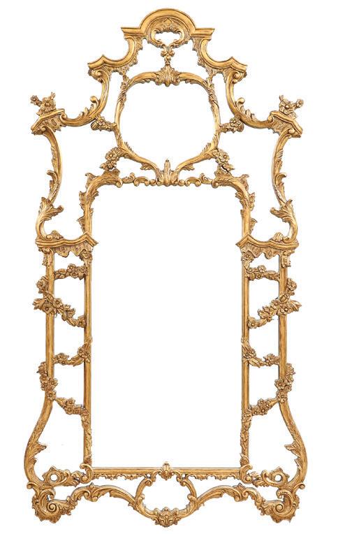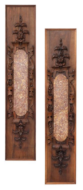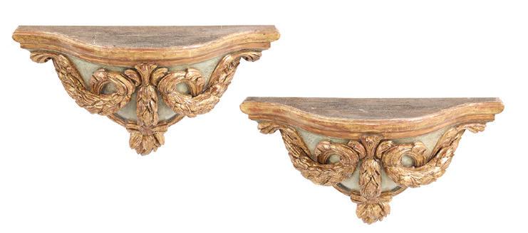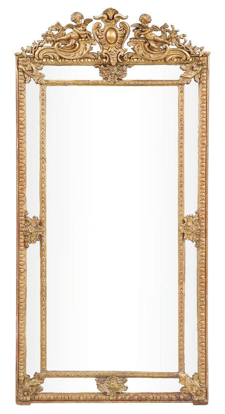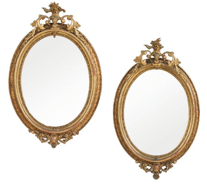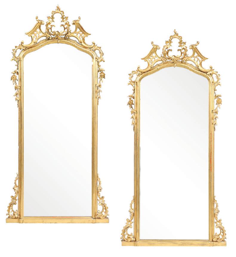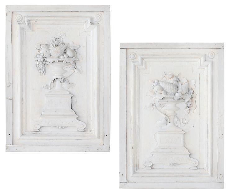 first quarter 20th century, the coved surrounds with gadrooned edges set with urn-form finials and scrollwork, supporting swags of bellflowers, the lower portion with ram’s heads and bellflower drops framed with scrollwork.