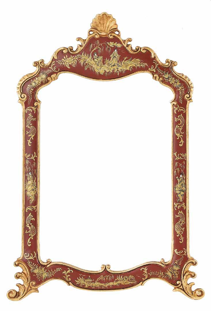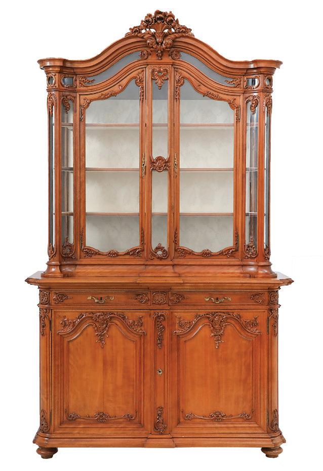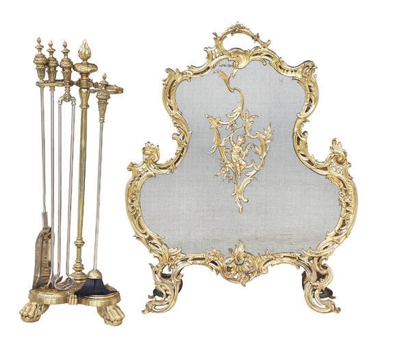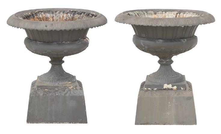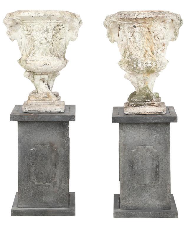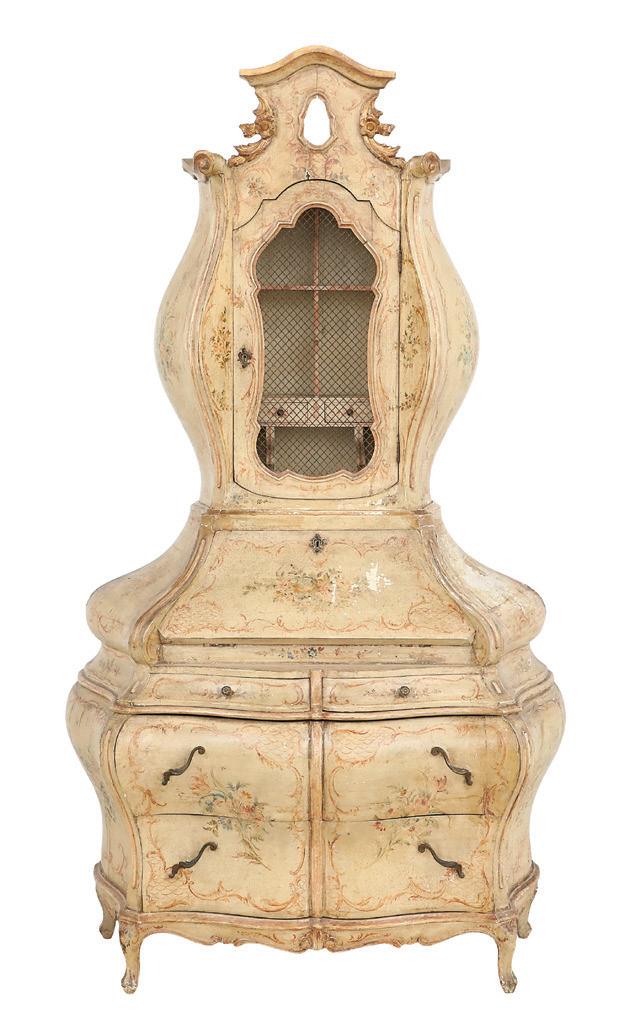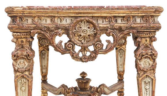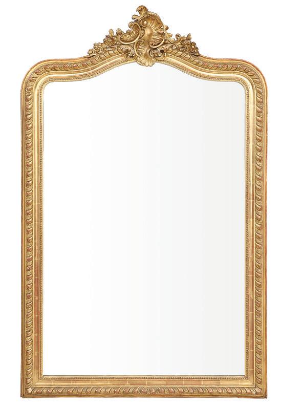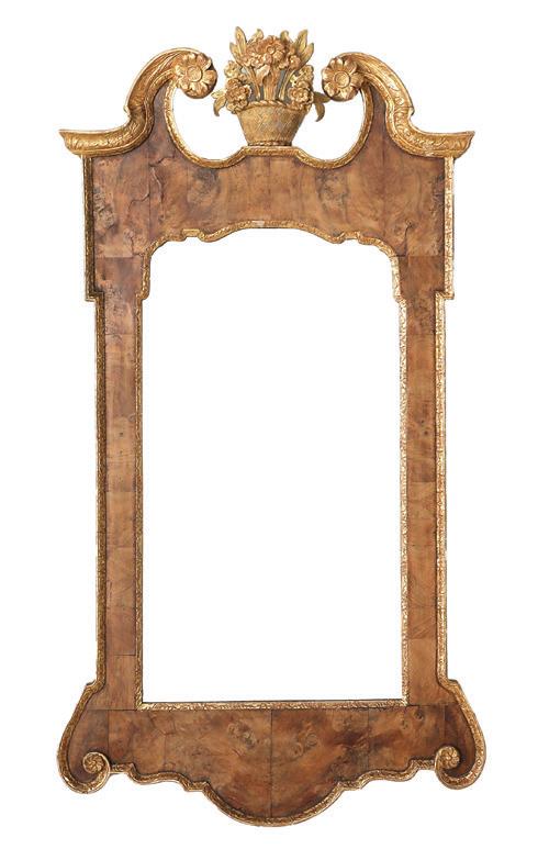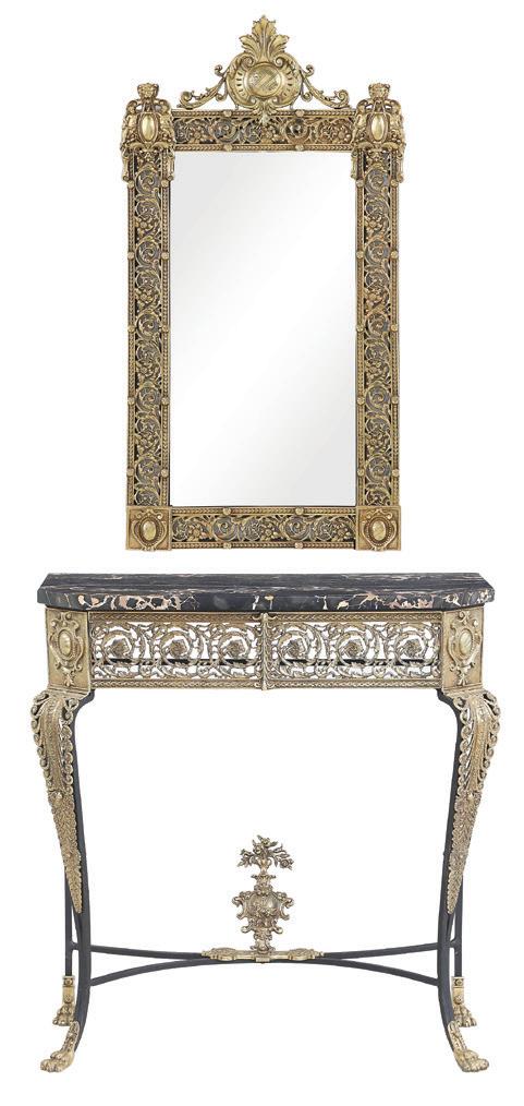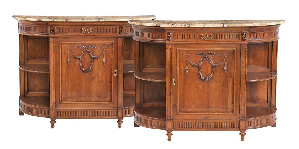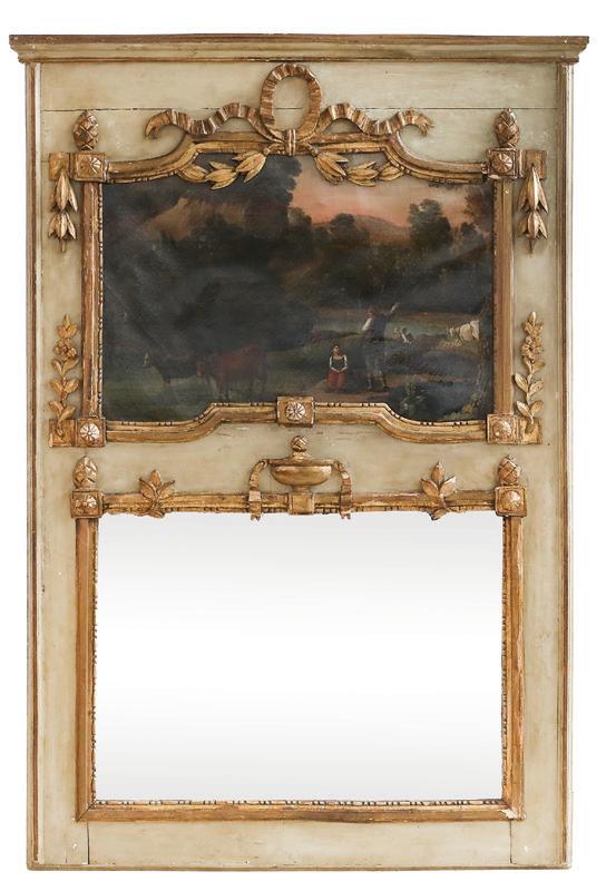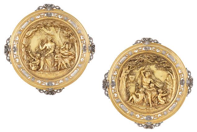 first quarter 20th century, the coved surrounds with gadrooned edges set with urn-form finials and scrollwork, supporting swags of bellflowers, the lower portion with ram’s heads and bellflower drops framed with scrollwork.