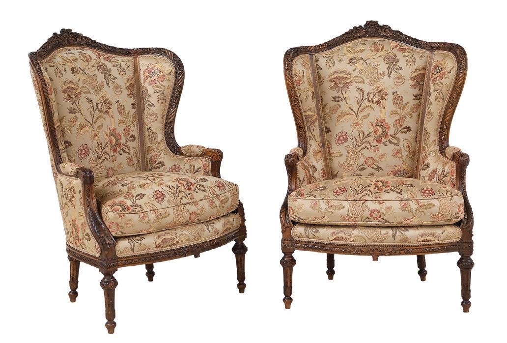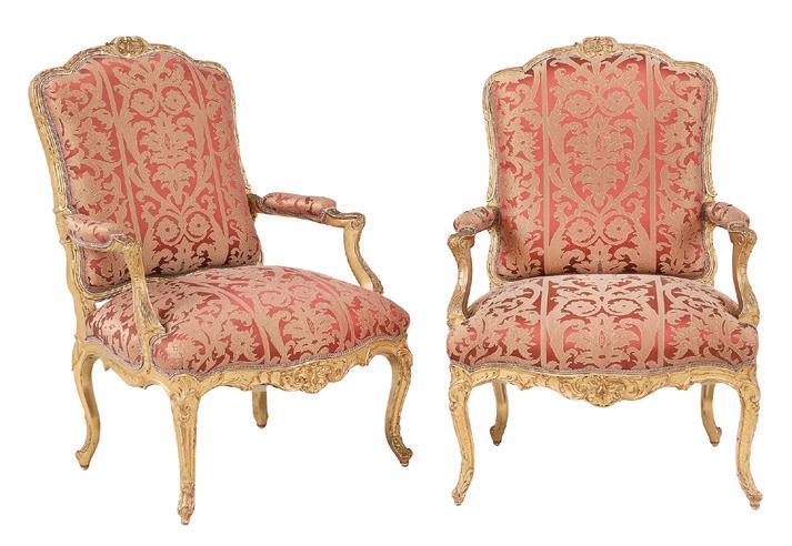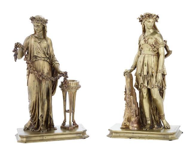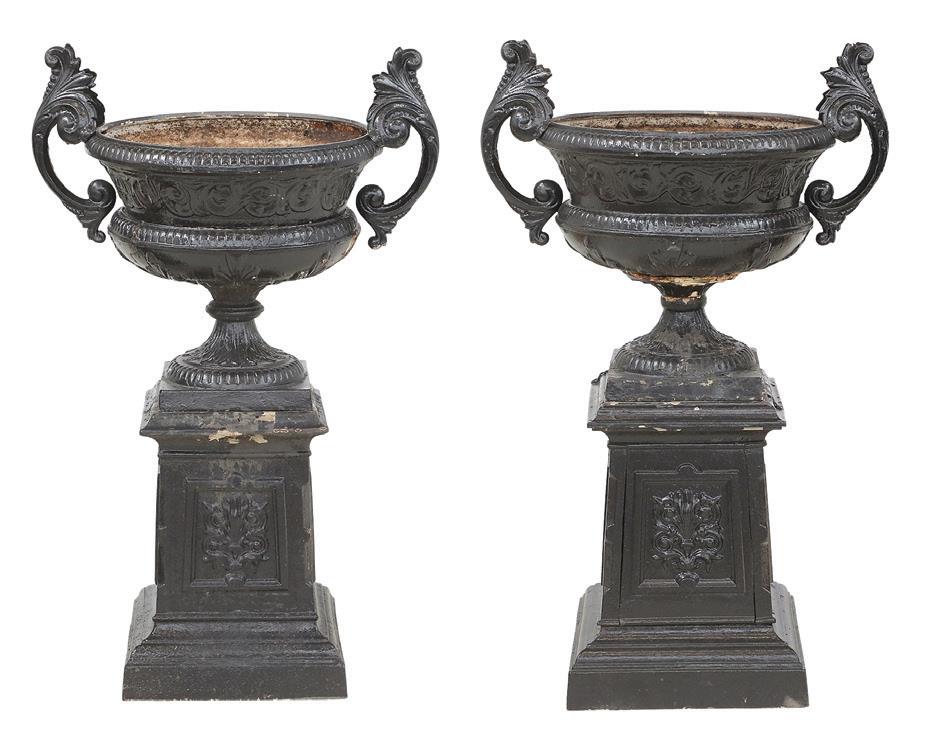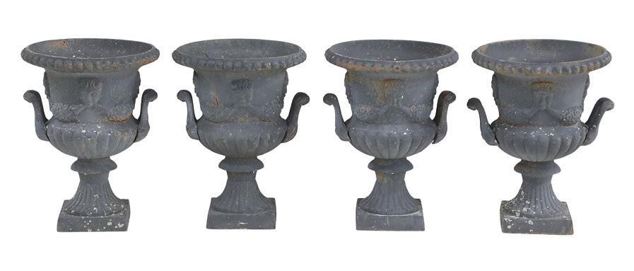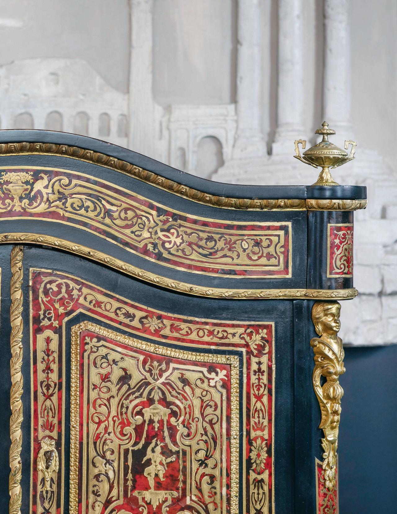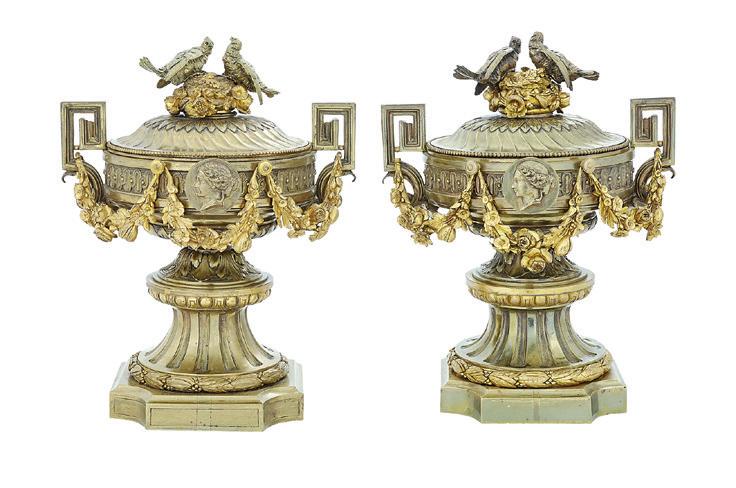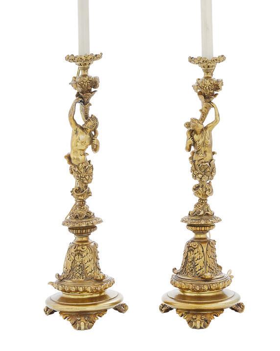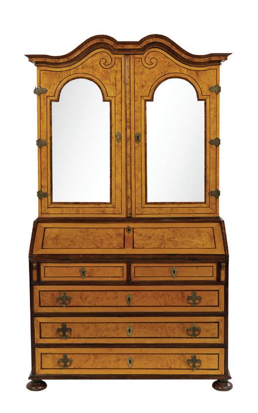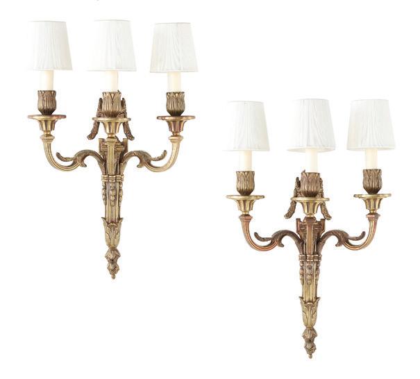first quarter 20th century, the coved surrounds with gadrooned edges set with urn-form finials and scrollwork, supporting swags of bellflowers, the lower portion with ram’s heads and bellflower drops framed with scrollwork.