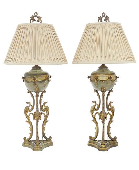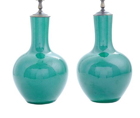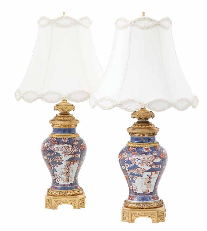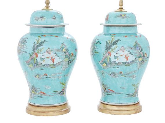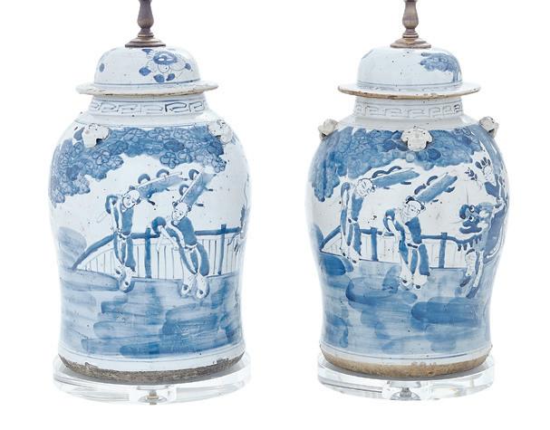 20th century, now mounted as lamps, the bodies decorated with peonies and ho-ho birds on a cobalt ground, the necks and bases with peonies and scrollwork, on pierced wooden bases, mounted with shades.