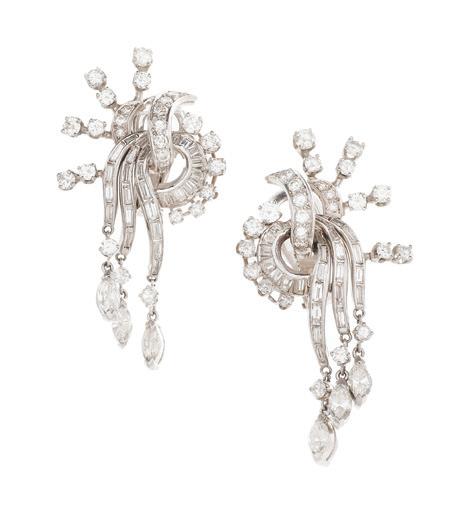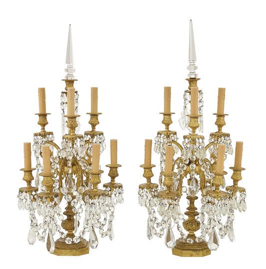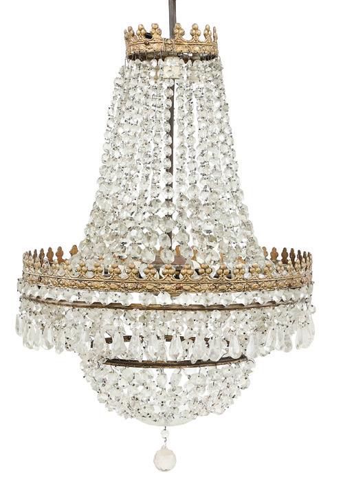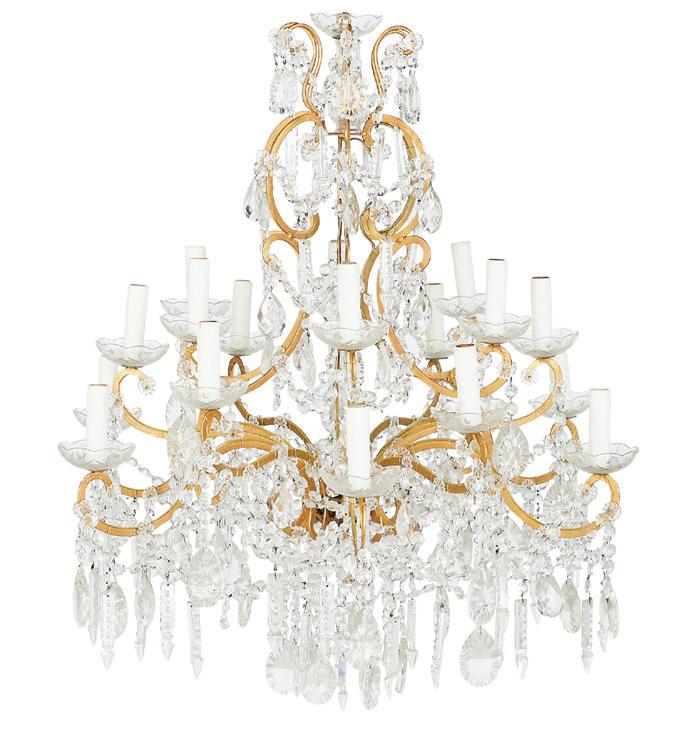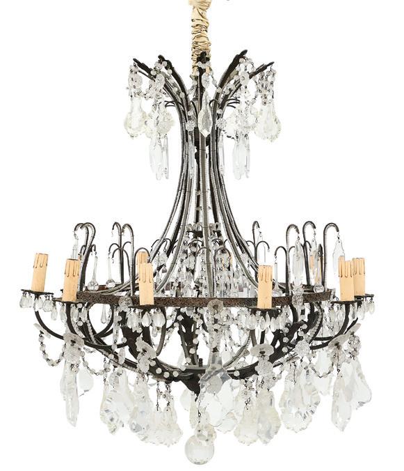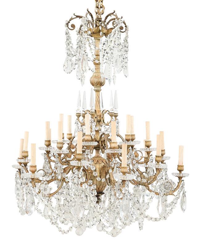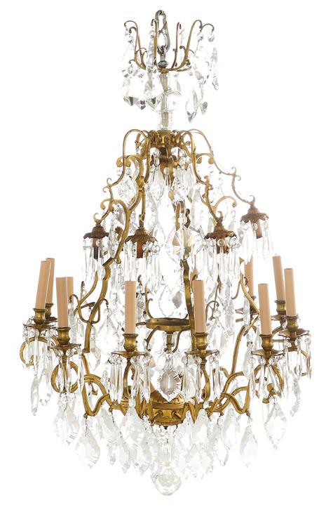 third quarter 20th century, of baroque inspiration, the twelvelight chandelier with a standard clad with vasiform cut crystal, set with curved candle arms terminating in inverted bell-form candle cups and scalloped drip pans, the arms hung with large cut glass prisms, the upper section set with two tiers of cut glass drops.