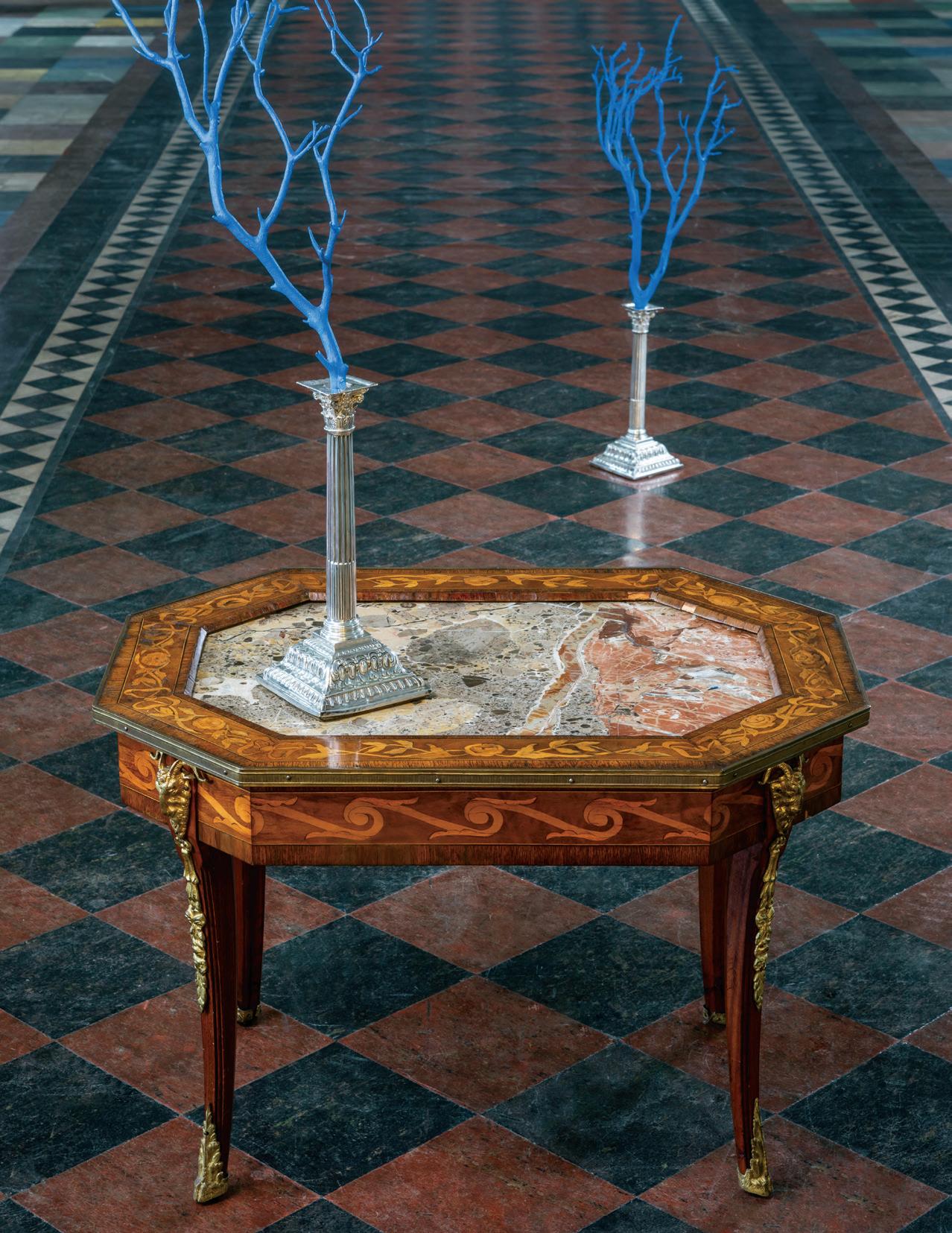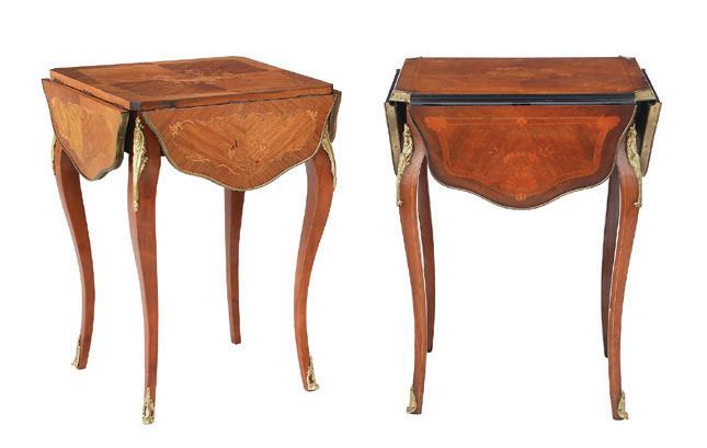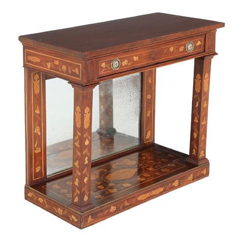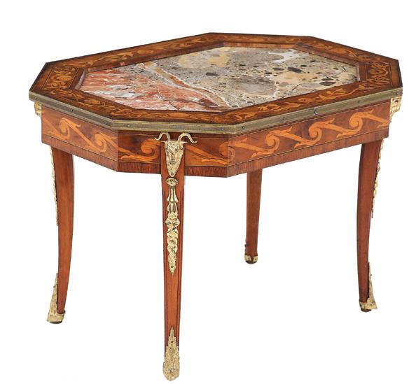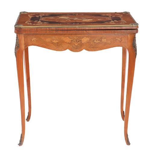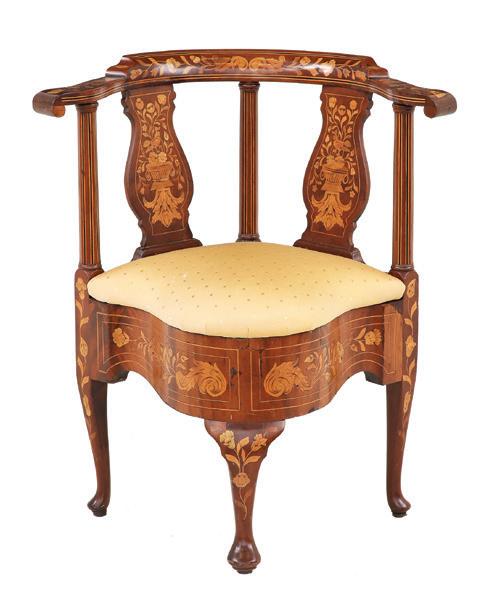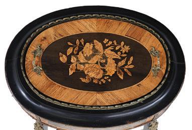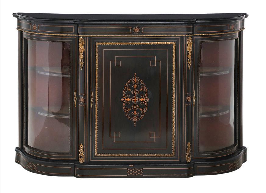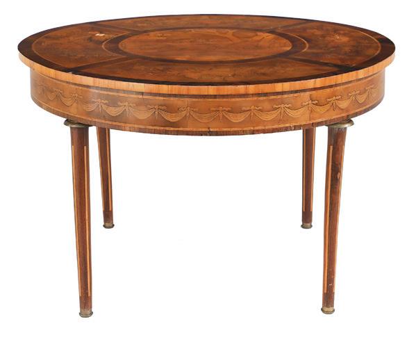 early 20th century, the undulating D-form top with a foliate ribbon-inlaid band, above a conforming case fitted with a central cutlery drawer flanked to one side by a deep drawer and to the other by a cupboard, all richly inlaid with scrolling floral and foliate patterns, raised on tapering square legs ending in spade feet.