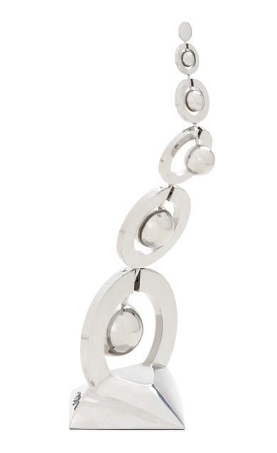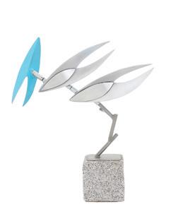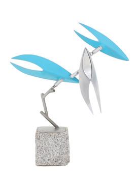 blue-painted aluminum kinetic sculpture incised signature and dated at edge of self-base, on an integral stone base. overall h. 20”, span 17”