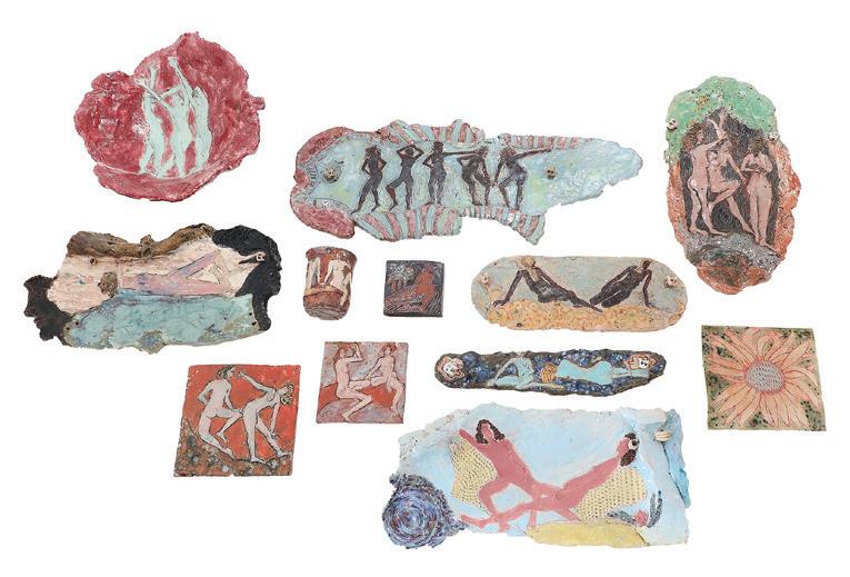 painted, glazed and incised pottery of figural motifs, including ten tiles, one bowl and one vase, most with incised signature.