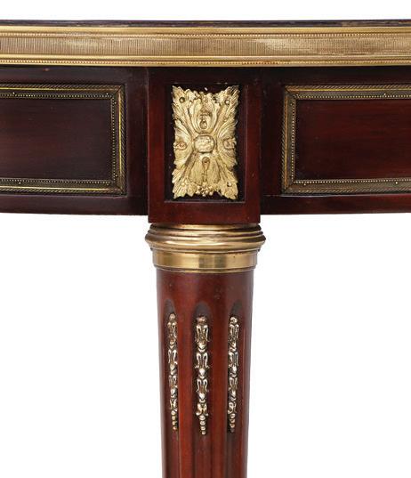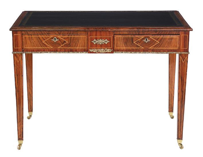 mid-19th century, the brass rail with urn finials, above a D-form top, over a conforming frieze fitted with two drawers, each inlaid with ebonized stringing, raised on ring-turned, tapering circular legs ending in tall toupie feet.