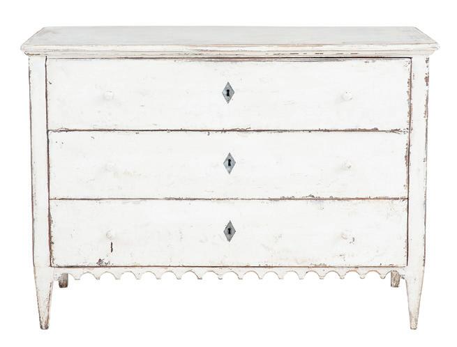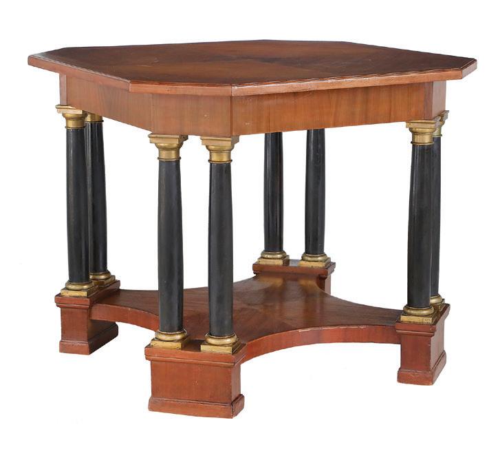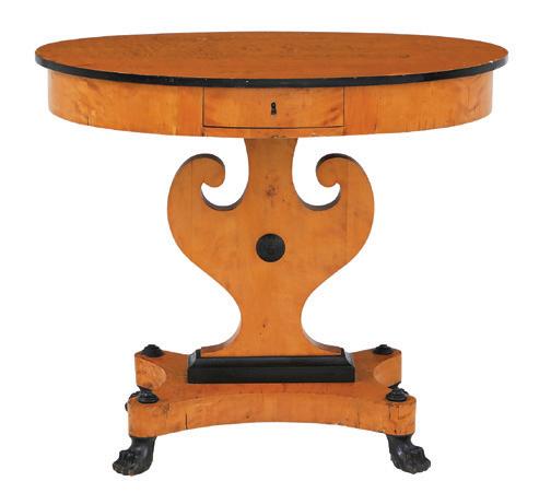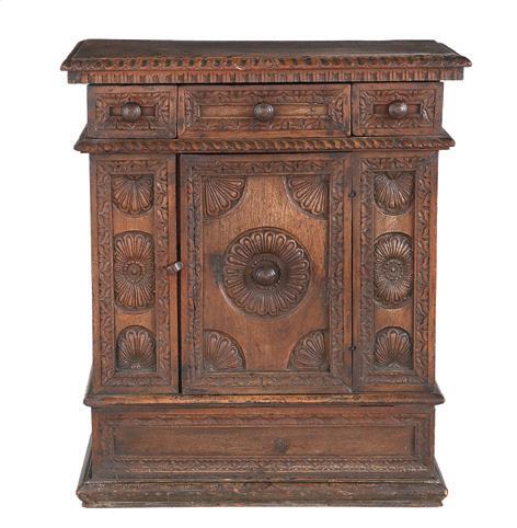early 19th century, the associated top with throughmortised ends and plate rails, the base with three side-by-side drawers over a central scalloped opening flanked by cabinets to each side.