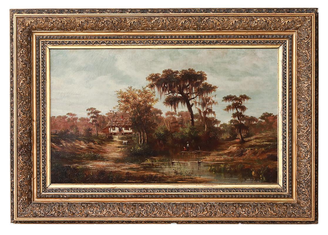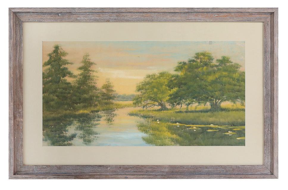 “Cattle by the Duck Pond” oil on canvas signed lower right and label with artist and title en verso. Framed. 20” x 30”, framed 28” x 38” $1,500-$2,500