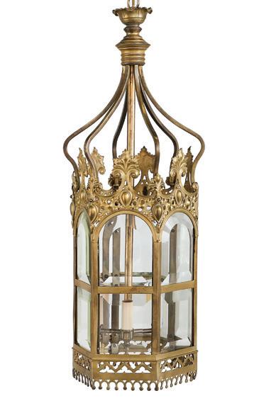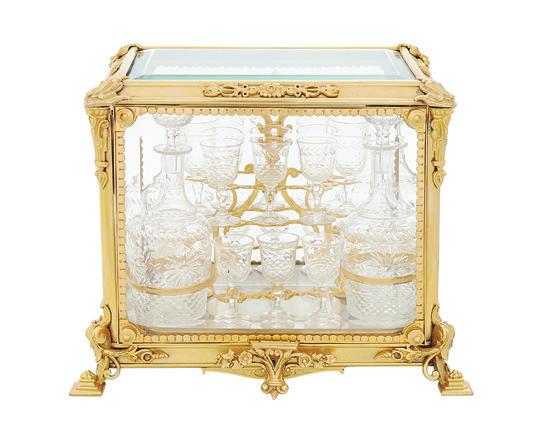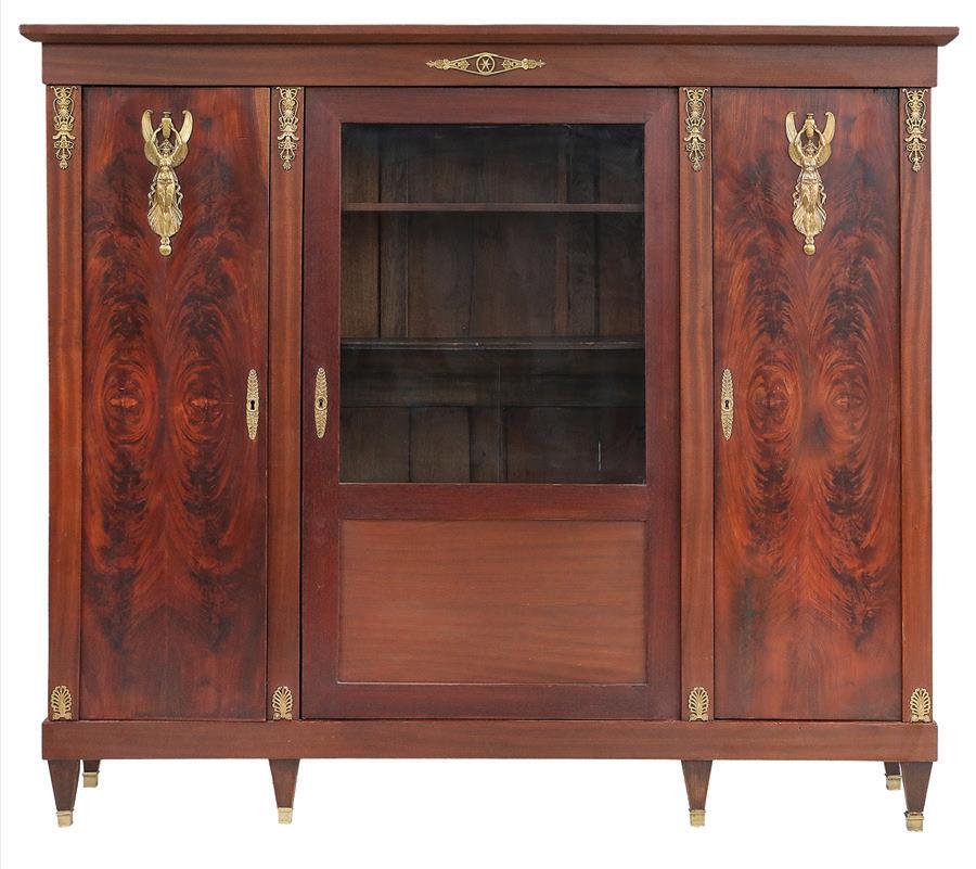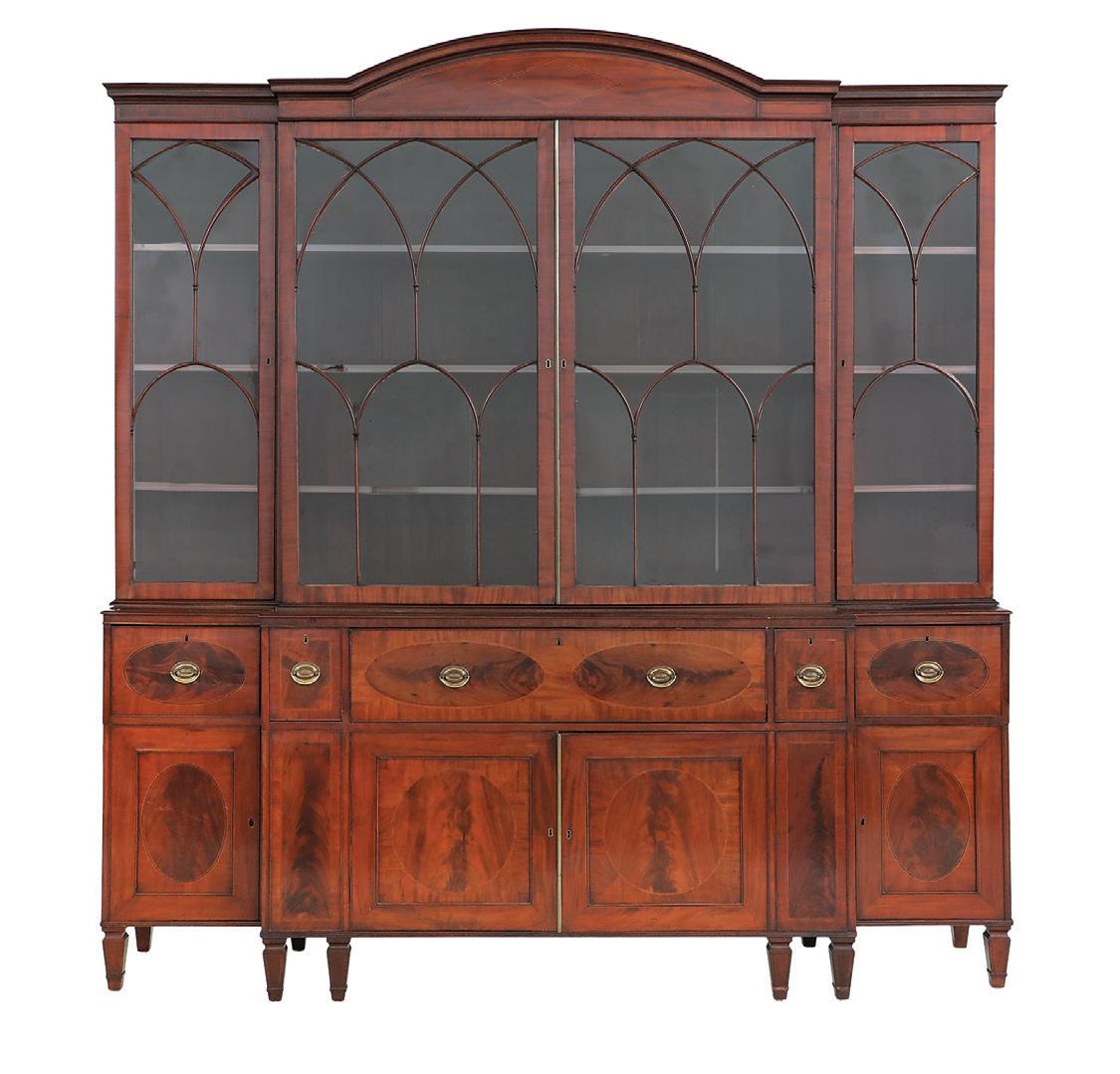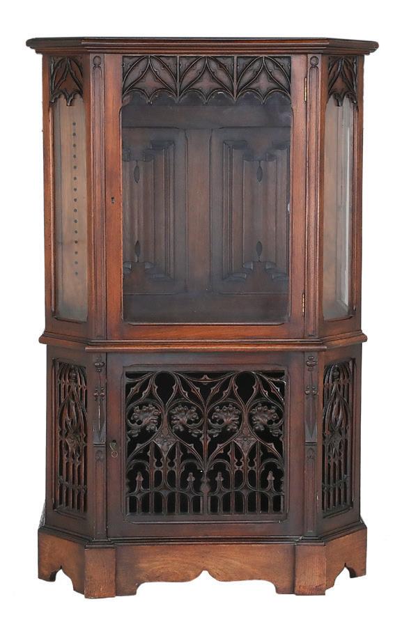 early 20th century, the upper portion with a central glazed door and lighted ends, the interior back with carved linen fold panels, the exterior with Gothic tracery, the base with Gothic grillwork and a central front door, and the side ends with additional doors.
