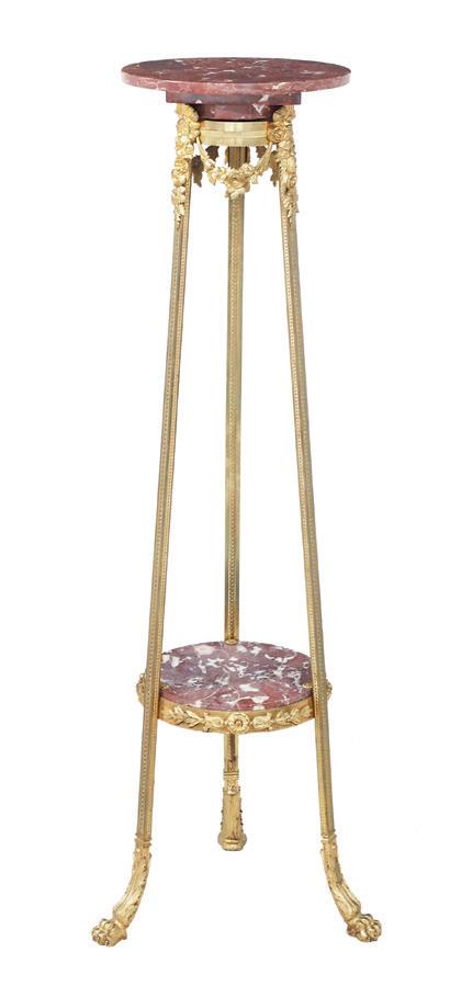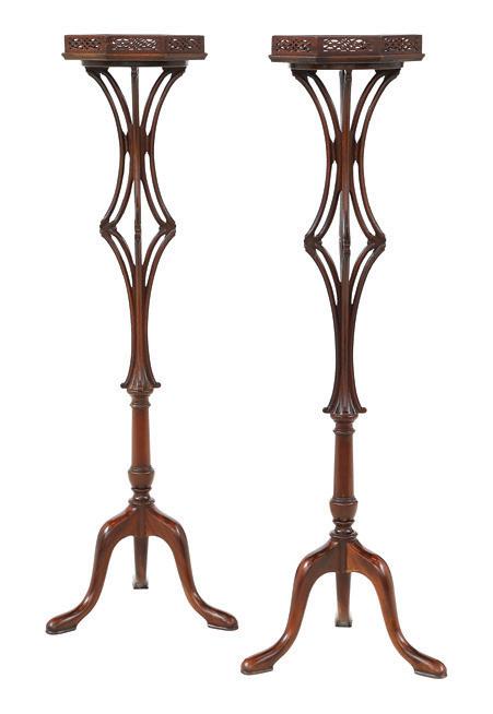 each with an octagonal top with a Chinese Chippendale-style fretwork gallery over a shaped, pierced and carved standard joined to a tripodal base with cabriole legs ending in pad feet.