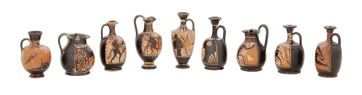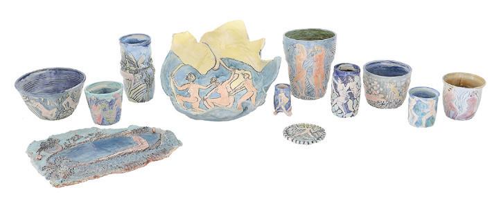 painted, glazed and incised pottery with figural motifs, including eight vases, two bowls and two tiles, each with incised signature.