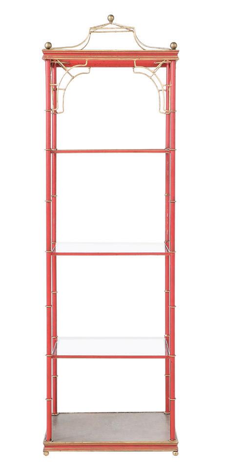 mid-20th century, in the Maison Jansen style, the steel frame on brass hoof feet, with brass lamb’s-head finials, and steel X-form stretchers on the sides, decorated with brass medallions, set with glass shelves.