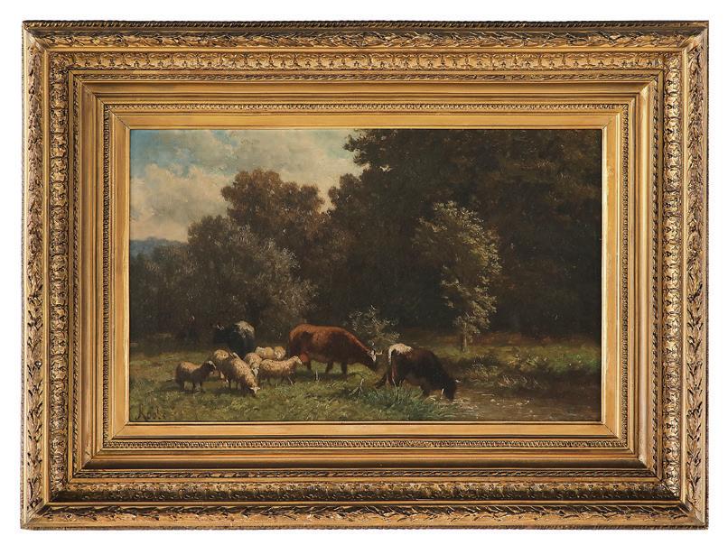 “Cows and Sheep Grazing by a Stream”
