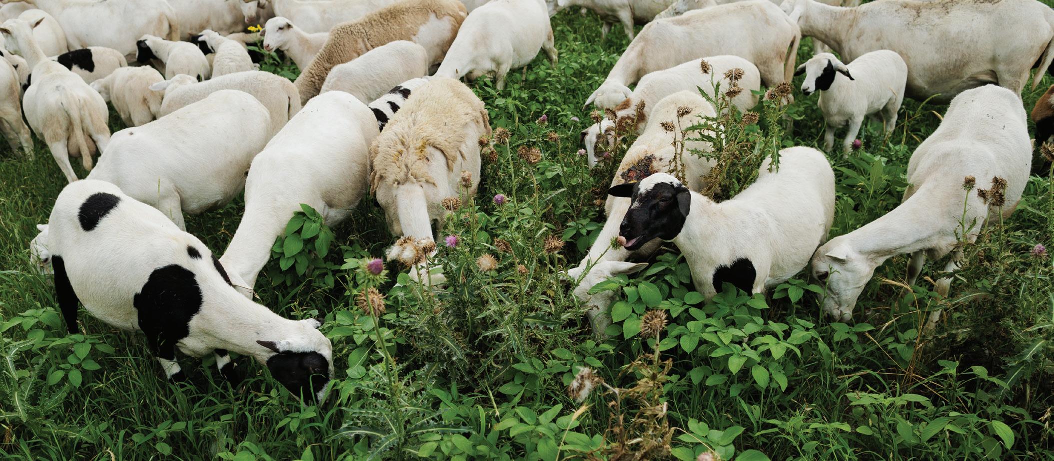 [Top] By spring of 2024, cattle on Noble's Headquarters Ranch developed a taste for an increasing number of native grasses and forbs that populated once entirely introduced on pastures. [Above] A flock of sheep browse a variety of forbs and grasses at Red River Ranch.