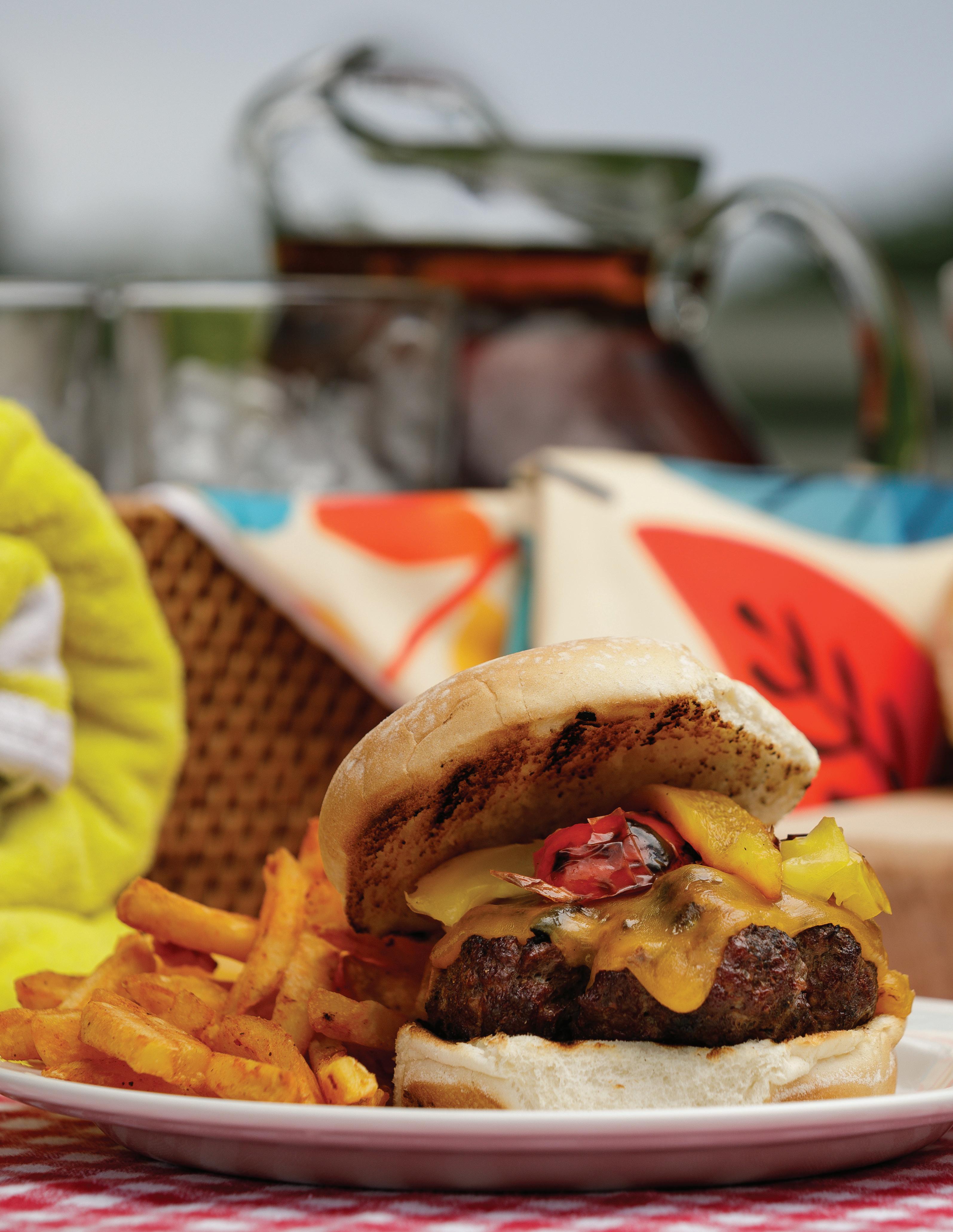 Finely chopped red onion and the kick of spices rev up these tasty burgers, topped with grilled peppers, cheese and your favorite condiments.
