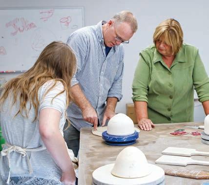Left to right: Emily Zhang ’23 works on a charcoal drawing in AP Studio Art; Maxwell Delinsky and Ryder Carlson, both ’28, create an artifact drawing for their middle school "Who We Are" identity week project; Visiting Artist Paul Briggs puts on a pinch pot ceramics workshop in Foster Gallery.
