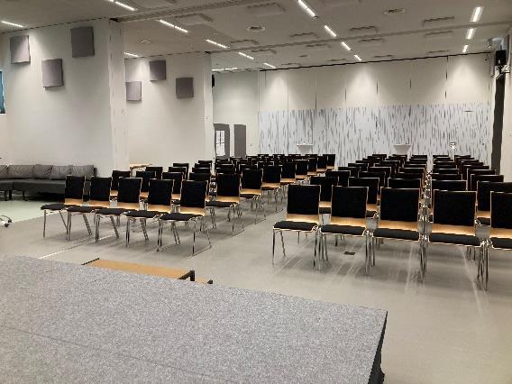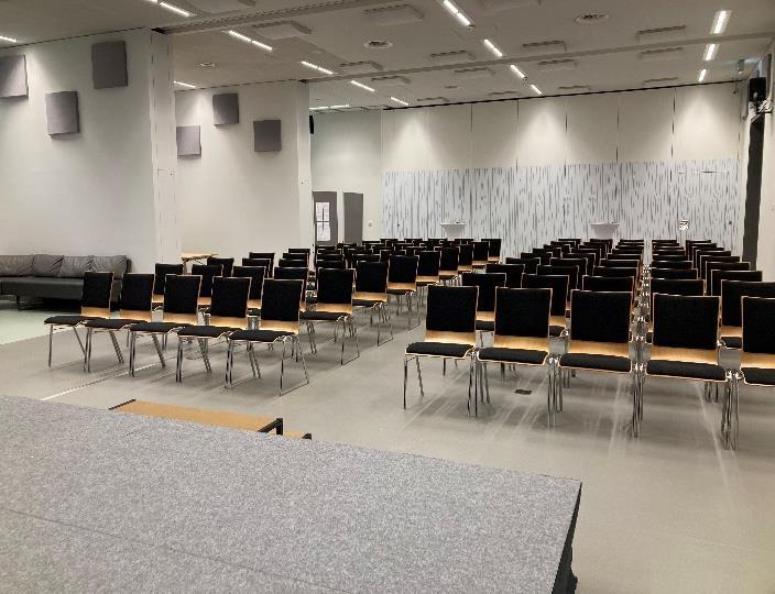 Die neu gestaltete Lounge bietet ein modernes, vielseitiges Ambiente für Events aller Art – von Präsentationen und Vorträgen bis zu Workshops und Seminaren. Dank flexibler Raumteiler lässt sich der Saal individuell anpassen und schafft so ideale Rahmenbedingungen für jedes Veranstaltungskonzept. Ein fix integrierter Beamer (ca. 3.000 Lumen) sowie eine 3,5 × 3,5 m Leinwand sorgen für professionelle Präsentationen und ein überzeugendes Erlebnis für Ihre Gäste