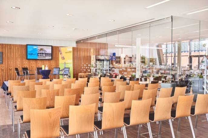 Das modern und offen gestaltete Foyer eignet sich durch die direkte Anbindung zur hauseigenen Gastronomie besonders für festliche Empfänge, Konferenzen und Vorträge, aber auch für Weihnachtsfeiern, Hochzeiten und andere private Feste.