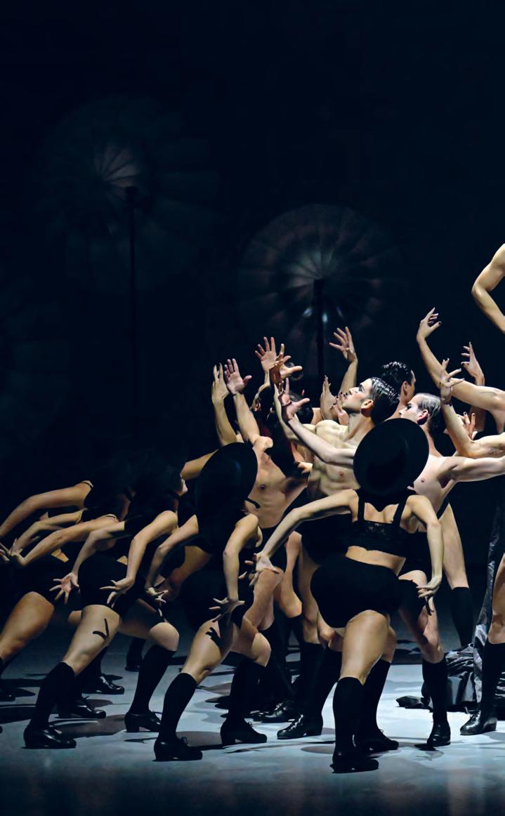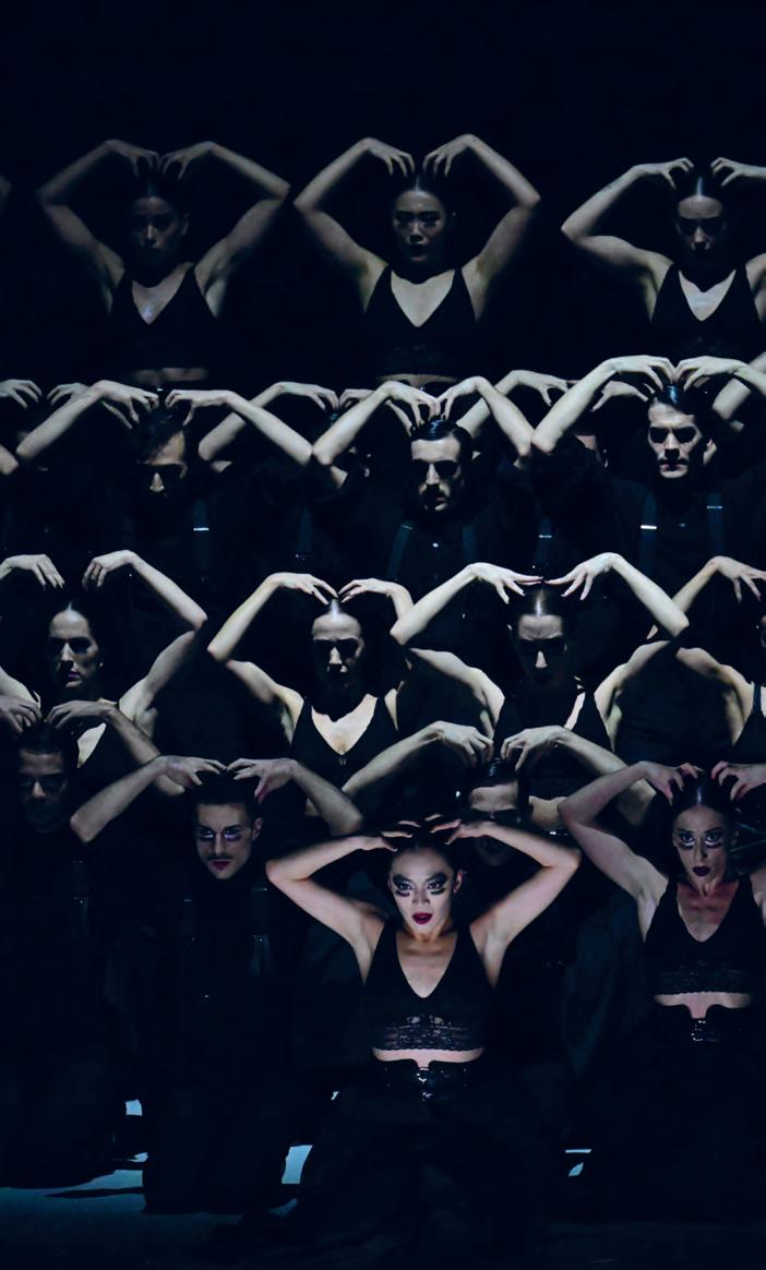 von Geschlechternormen getragen. Das Bühnenbild (Max Glaenzel) verstärkt den fotografischen Blick: Leinwände fangen die Schatten der Tanzenden ein, Sesselreihen stehen für ein unsichtbares Publikum bereit, Scheinwerfer und Lichter erinnern an das Setting in einem Fotografiestudio. Dass gerade Morau diesen Dialog mit einem Fotografen sucht, erscheint dabei als besonders passend: Als Leiter des Künstler:innenkollektivs La Veronal vereint er Regie, Bühnenbild, Kostüm- und Lichtgestaltung in einer transdisziplinären Handschrift, die immer wieder nach neuen Begegnungen von Bewegung und Bild sucht. Moraus Bewegungssprache greift auf den kraftvollen, emotiven Ausdruck des Flamenco zurück –ruckartige Armbewegungen, starke Torsi, stampfende Schritte, die den Körper selbst zum Rhythmusinstrument machen. In einem steten Wechsel von Szenen verdeutlicht sich die Kraft der Gruppe. So sieht das Publikum einmal nur die synchronen, rhythmischen Beinbewegungen der Tanzenden, während die Oberkörper hinter einem Vorhang verborgen sind. Neben dem charakteristischen Bewegungsprofil des Flamenco tritt aber auch Moraus eigener Stil hervor. Gruppenszenen voller Lebensfreude wechseln mit düsteren, beinahe grotesken Darstellungen: lautlose Schreie, verzerrte Gesichter, das Spiel mit dem Unheimlichen. Die tanzenden Körper wirken dabei oft wie Marionetten, geführt von einer unsichtbaren Kraft im Verborgenen.