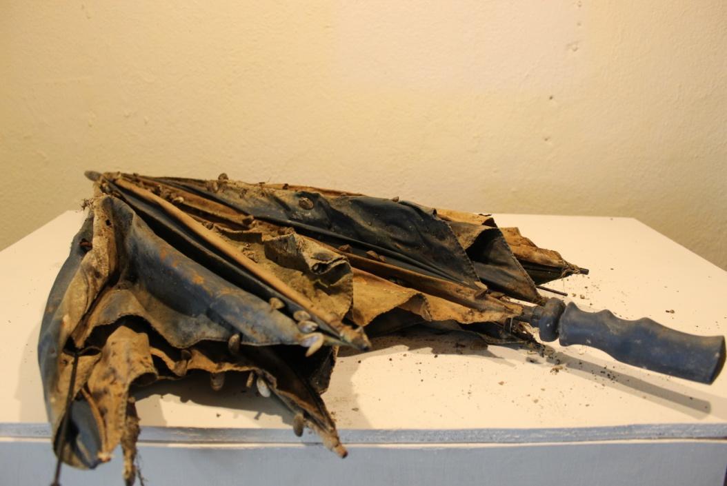 Using the found object umbrella covered in zebra shells.