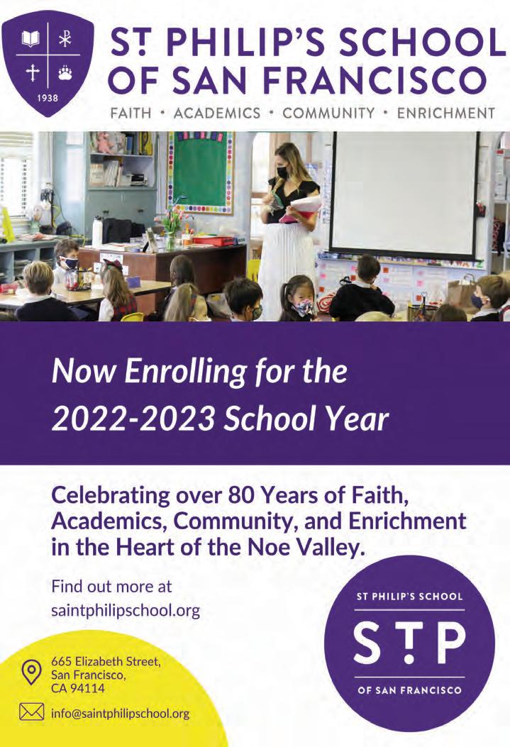 2 The Noe Valley Voice • October 2022 Complementary online estate planning for parents workshop dates: October 18th at 9 AM October 25tt at 12 PM November 15th at 9 AM November 29th at 12 PM Please scan the code to register or visit: https://www.defontelaw.com/ workshops Preserving Family Harmony Empowering Your Heirs Reflecting Your Values info@defontelaw.comwww.defontelaw.com We don’t just talk the talk, we walk the walk. Our care is one-of-a kind. We don't just treat symptoms. We treat your child from the inside out. We find the right remedy. We gladly offer safe alternatives to antibiotics when appropriate. We offer house calls. Kids don’t come with manuals. Let us be your village. We’re always here. Your GetzWell pediatrician is available 24/7. Just call or email. We’ll answer. We are what we eat. We believe nutrition and functional medicine are powerful ingredients for growing kids. 415.826.1701 | WWW.GETZWELL.COM 1701 CHURCH ST, SAN FRANCISCO | 1800 UNION ST, SAN FRANCISCO