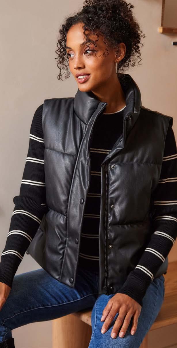 Faux Leather Quilted Puffer Vest Sleek city style with cool, modern edge. Crafted from luxe faux leather with a subtle sheen, this vest offers both warmth and structure. The high stand collar, snap-front closure, and clean lines give it a polished feel, while the oversized patch pockets add function and attitude. Layer it over a hoodie or style it with a turtleneck and trousers; this statement piece is an effortless way to elevate your fall wardrobe. 100% Polyurethane. Black faux leather. 3L34200 sizes XS - XL $148