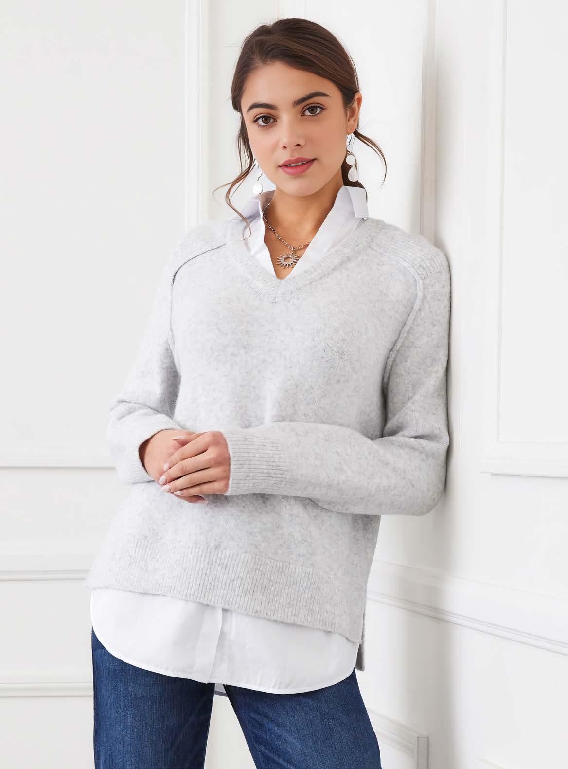 "Layering a collared shirt underneath a sweater is a super-simple styling trick that immediately makes a basic outfit look so current. It's made up of basics, with styling that's simple and straightforward. If you're worried about layers looking bulky, you can cheat a little with this easy layering trick."
