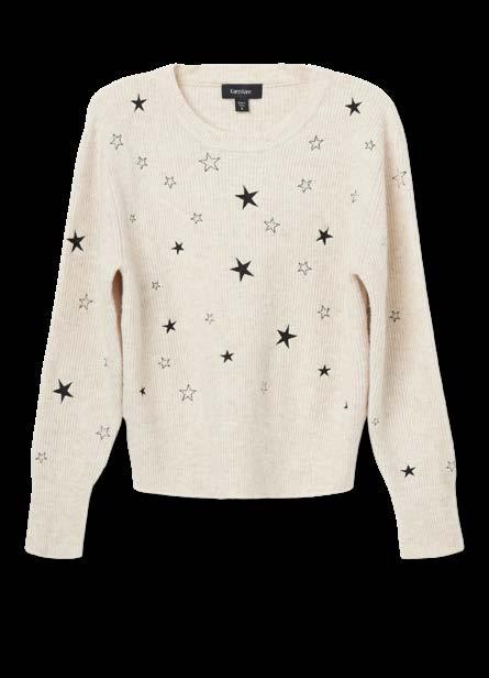 Embroidered Stars Sweater This ribbed sweater is a playful twist on a classic; it features an embroidered star motif that offers a touch of whimsy and charm. The relaxed fit, drop shoulders, and slightly cropped hem give it a casual feel, perfect with jeans or layered over a dress. 65% Polyester, 13% Acrylic, 13% Nylon, 6% Wool, 3% Spandex. Oatmeal. 3L89129