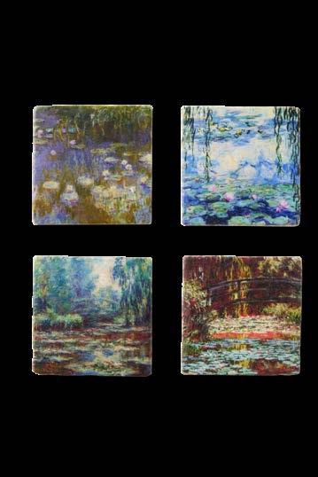 Immerse your tabletop in the tranquil beauty of Claude Monet with this enchanting set featuring dreamy depictions from his iconic Water Lilies and Japanese Bridge series. Each coaster captures the delicate interplay of light, reflection, and nature that define Monet’s impressionist masterpieces. Made in USA. D300162 4" x 4" inches $52