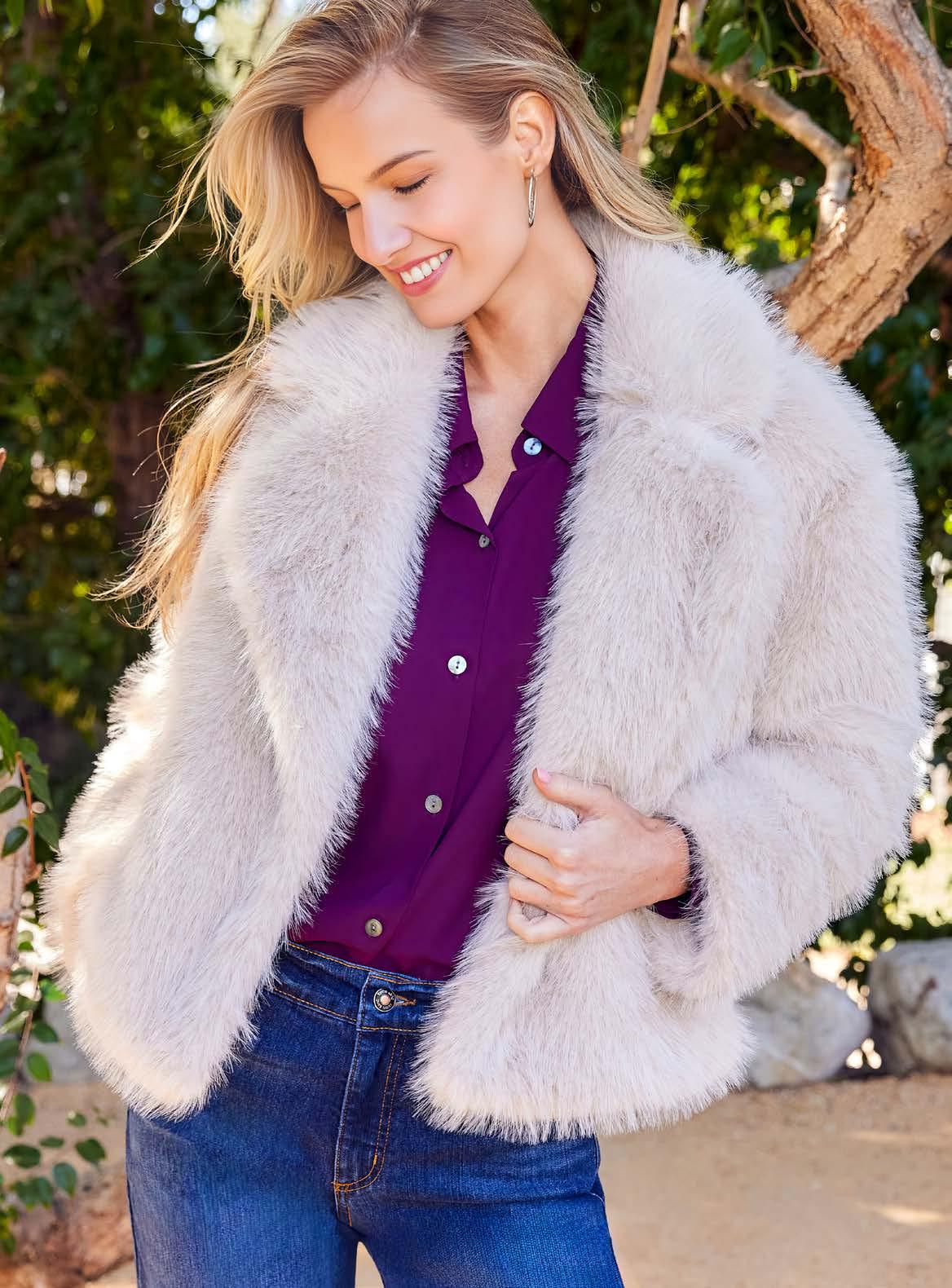 A luxurious coat, crafted from dramatic faux fur and completed with a draped collar and pockets. 100% Polyester. Stone faux fur.