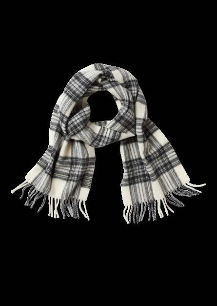 Merino Wool Fringed Plaid Scarf Perfect for keeping warm on chilly days. This soft, luxurious 100% pure merino lambswool scarf is milled and woven in a centuries-old mill in the British Isles. Measures 10" x 75" with 3.5" fringe on each end. Black with white. Made in the United Kingdom. S300014 black/white $75