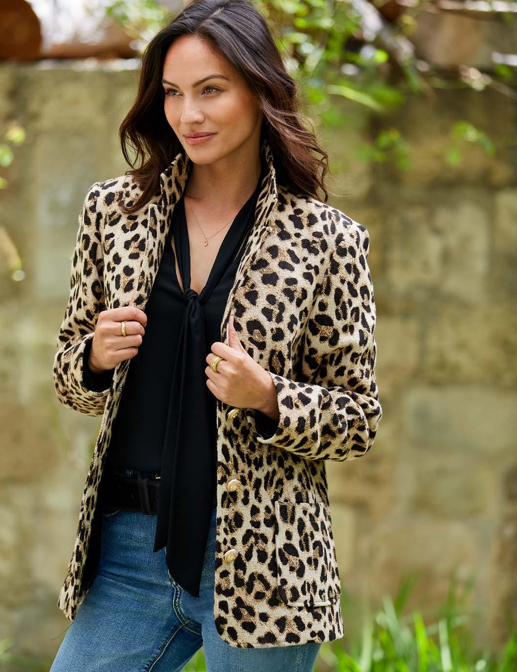 Animal Jacquard Blazer Perfectly fierce, this leopard-print jacket is a bold way to finish your look. Wear it open or closed with embossed gold buttons, a notched lapel, and patch pockets. 100% Cotton. Leopard print. 3L71400
