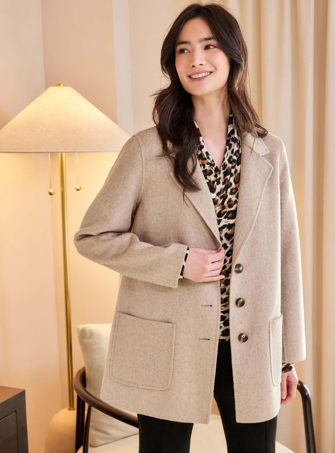 Brushed Double-Breasted Coat This jacket is a sophisticated and versatile wardrobe staple, crafted from a soft wool-blend fabric. The tailored silhouette features a notched lapel as well as classic flap pockets. It's perfect for layering over everything from denim and a t-shirt to a sleek turtleneck and trousers. 51% Wool, 49% Polyester. Oatmeal brushed coating. 3L33800 sizes XS - XL $298