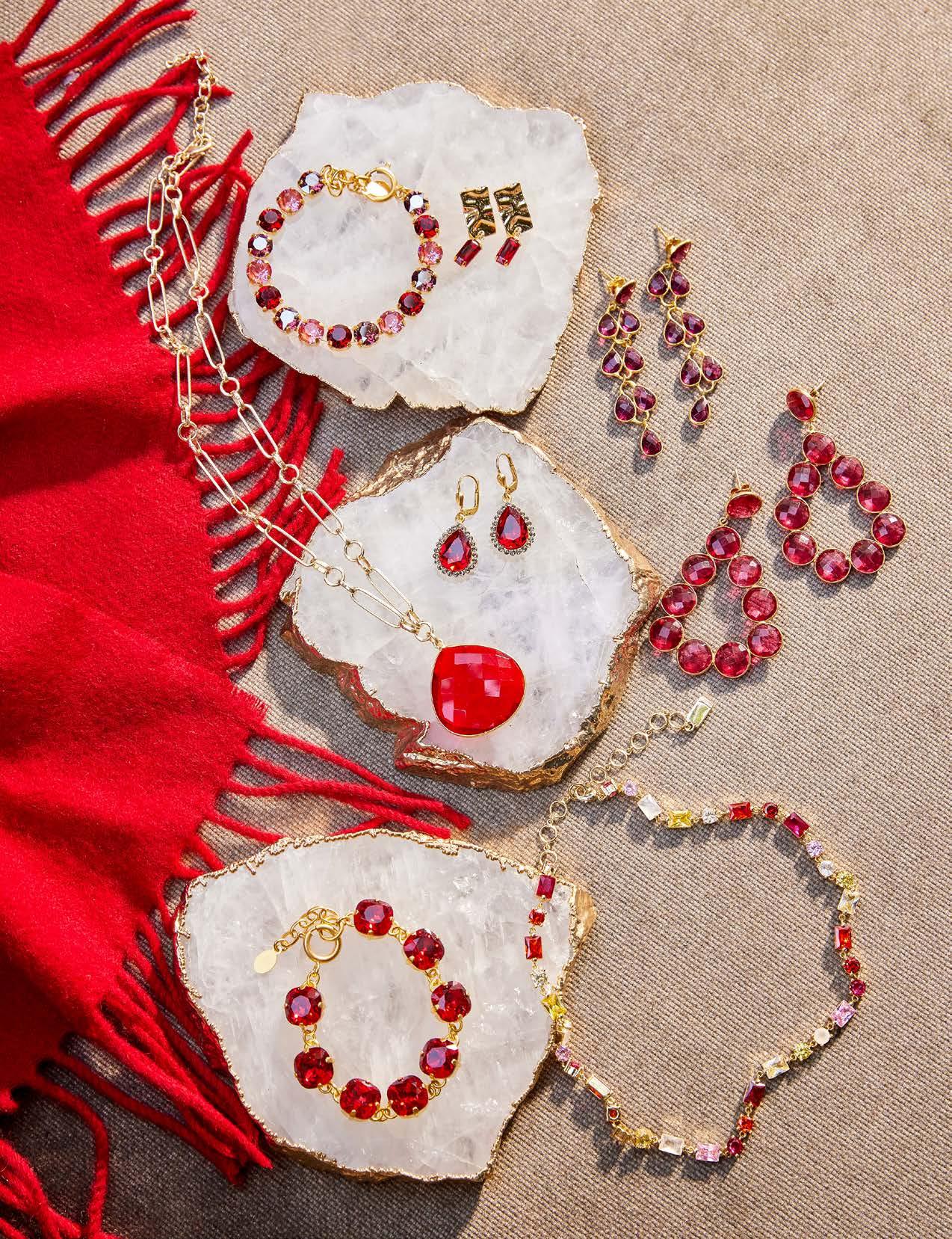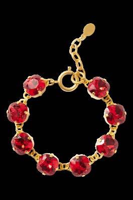 Large Crystal Bracelet Swarovski crystals set in 14-karat plated gold. Measures 7.5" with a 1.5" extender. Red. Also in emerald. Made in USA. B300075 red $148 | B300065 emerald $148