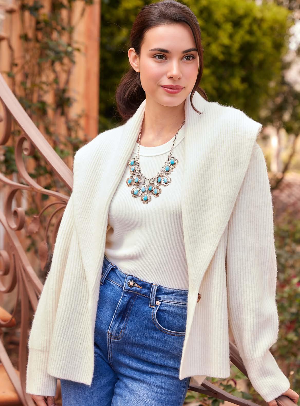 A chic sweater, finished with color-blocked contrasting detail. 74% Acrylic, 22% Polyester, 4% Spandex. Black with cream. Available at www.fifteentwenty.com