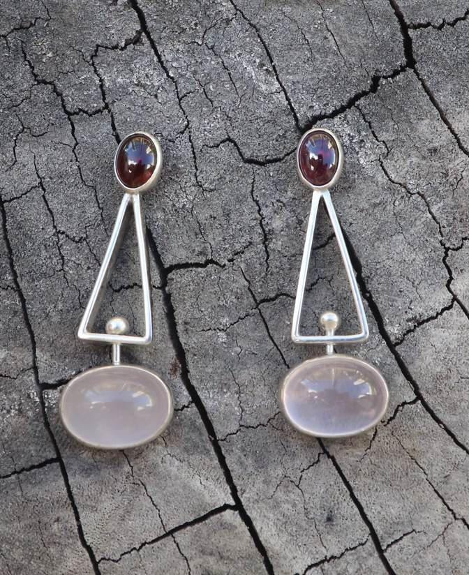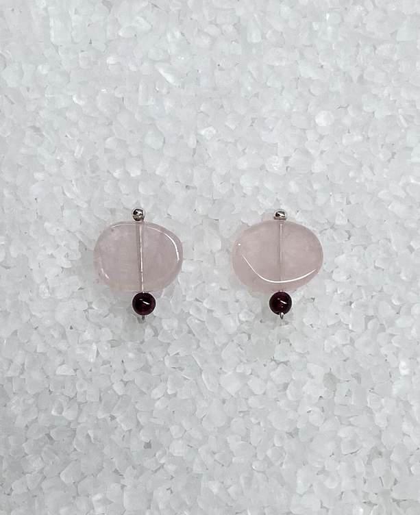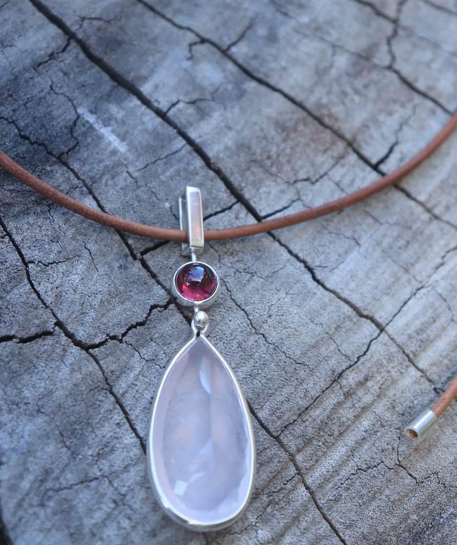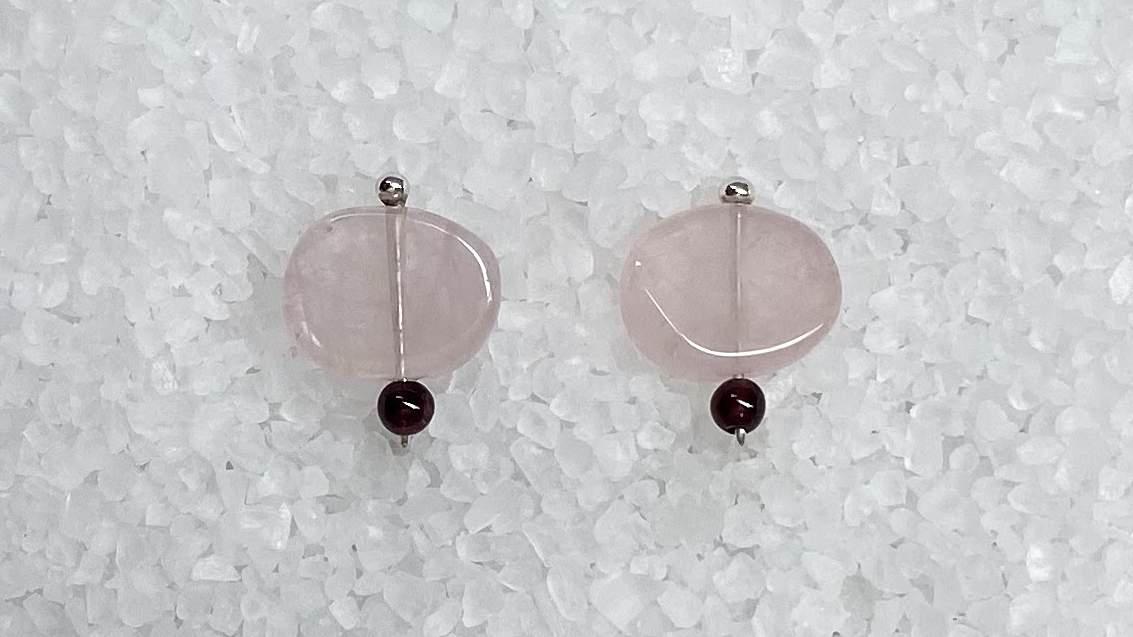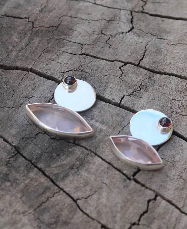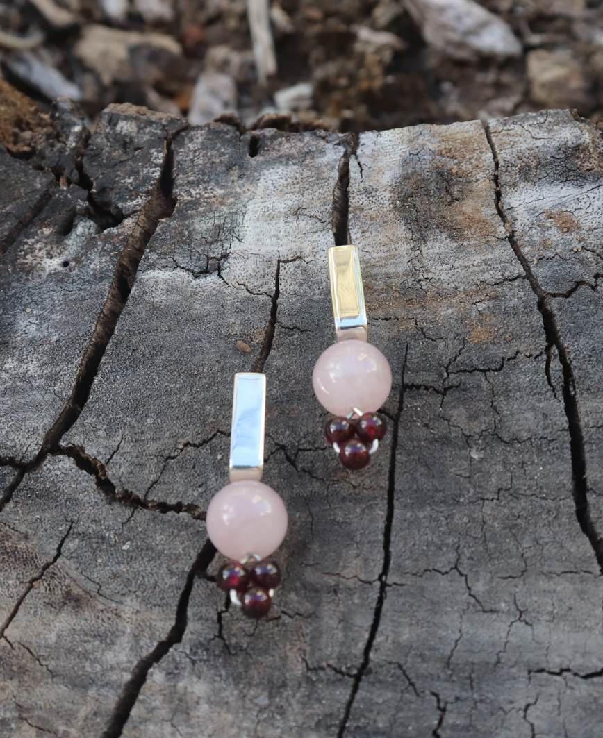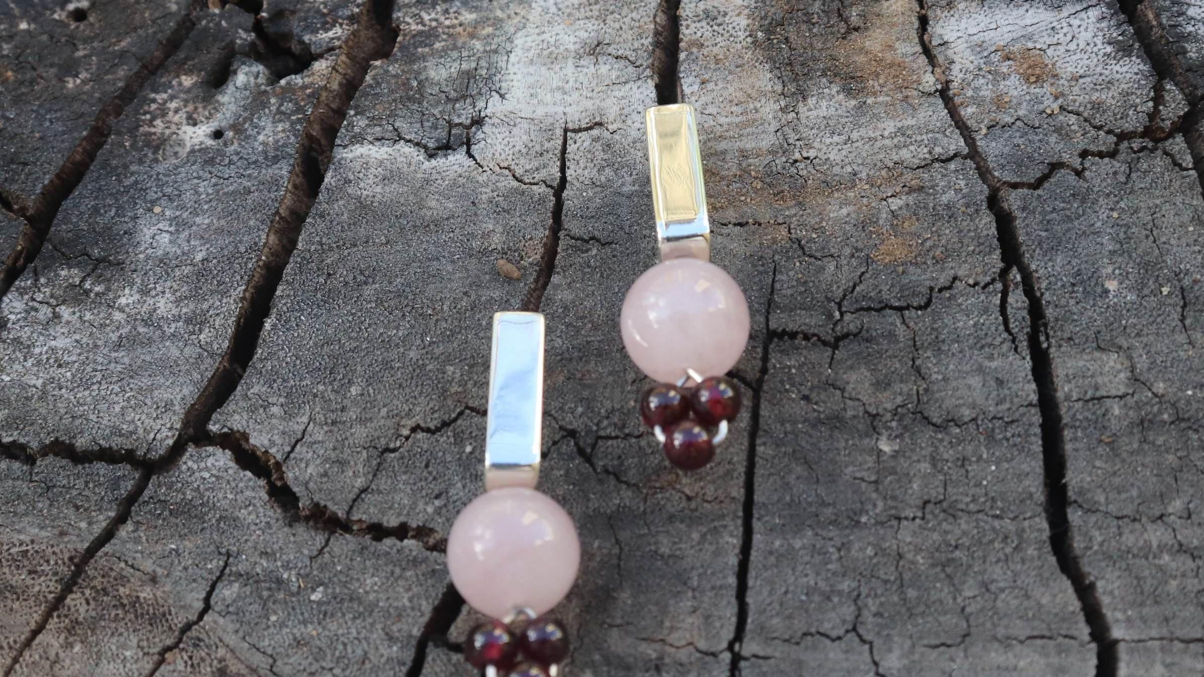 Quartzo Rosa é um respiro delicado e doce, trazendo nas suas peças minerais e metal: o quartzo rosa, a granada e a prata.