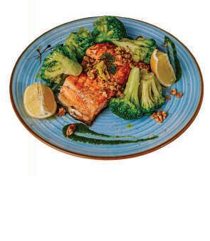 SOMON BROCOLI somon (PESTE), unt (LAPTE/LACTOZA), brocoli, NUCA, pesto ( busuioc, ulei de masline, usturoi, parmezan, nuci de pin si sare), Lamaie